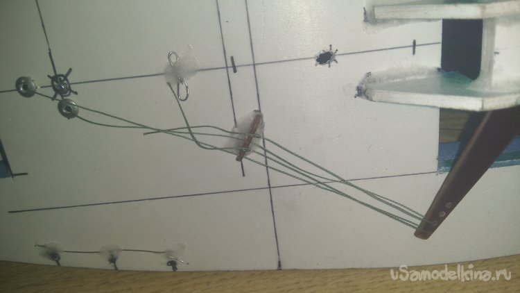 Крепления гиков к мачтам я делал из проволоки и обрезков от стержней шариковых ручек все это приматывал нитками и фиксировал клеем.
