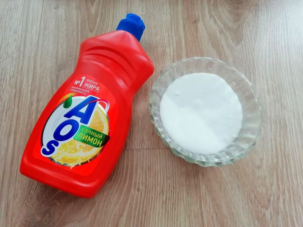 Берем самое обычное жидкое средство для мытья посуды и добавляем к нему соль. Советую брать мелкую соль экстра.