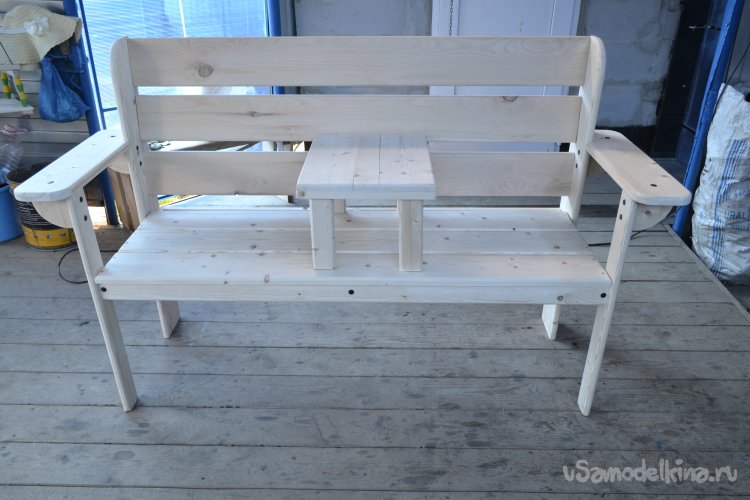 Подлокотники – это не только элемент комфорта, но и важная деталь, придающая скамейке завершенный вид. Два отрезка досок длиной 550 мм были закреплены на боковых частях каркаса, между передними и задними ножками. Я расположил их так, чтобы они переходили от передней части ножки к задней. Для надежности крепления я использовал мебельные шурупы, которые обеспечивают прочное соединение и эстетичный внешний вид. Затем пришла мысль сделать съёмный столик, в итоге получилась вот такая конструкция. Это небольшой, но продуманный элемент добавил скамейке ещё больше практичности, превратив её в идеальное место для чаепития или чтения на свежем воздухе. Размеры все примерные.