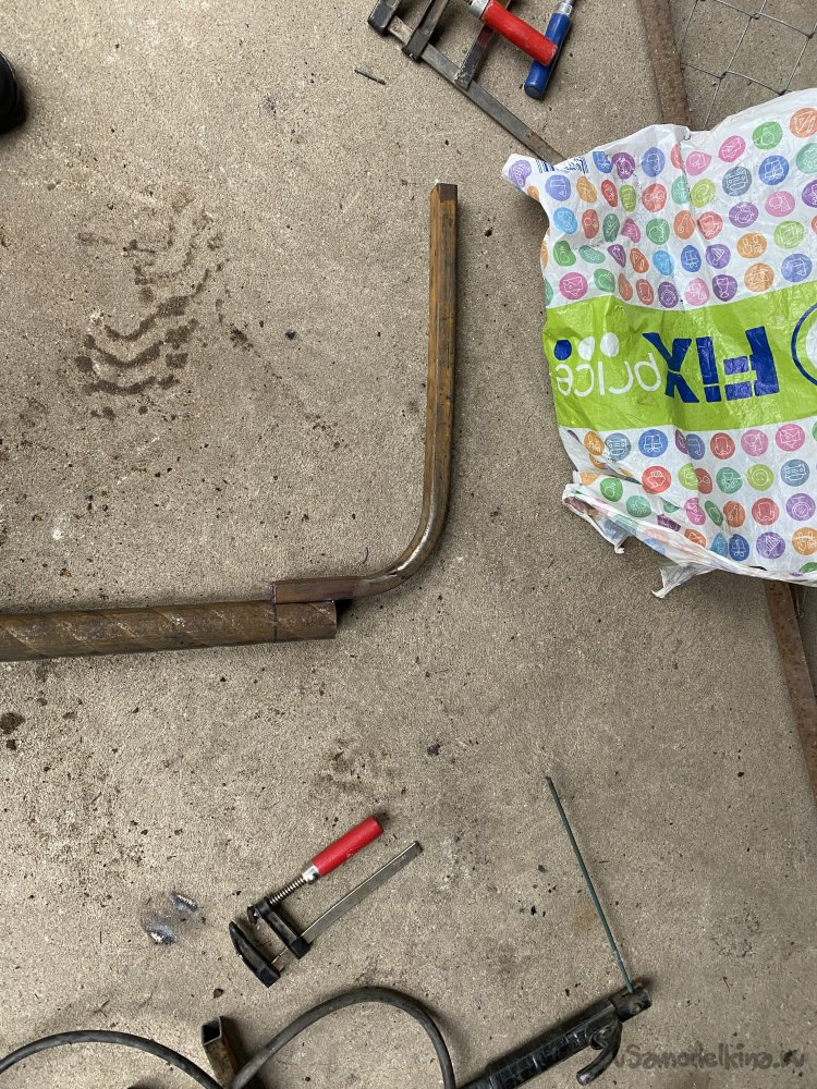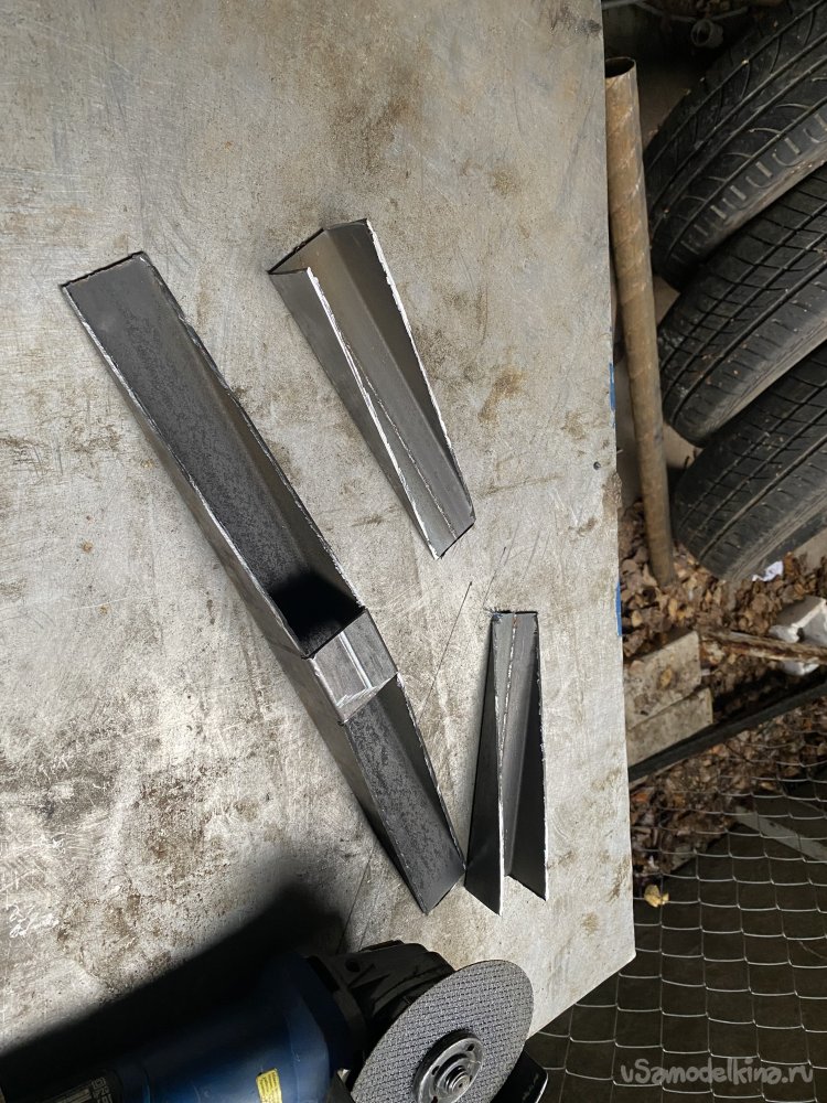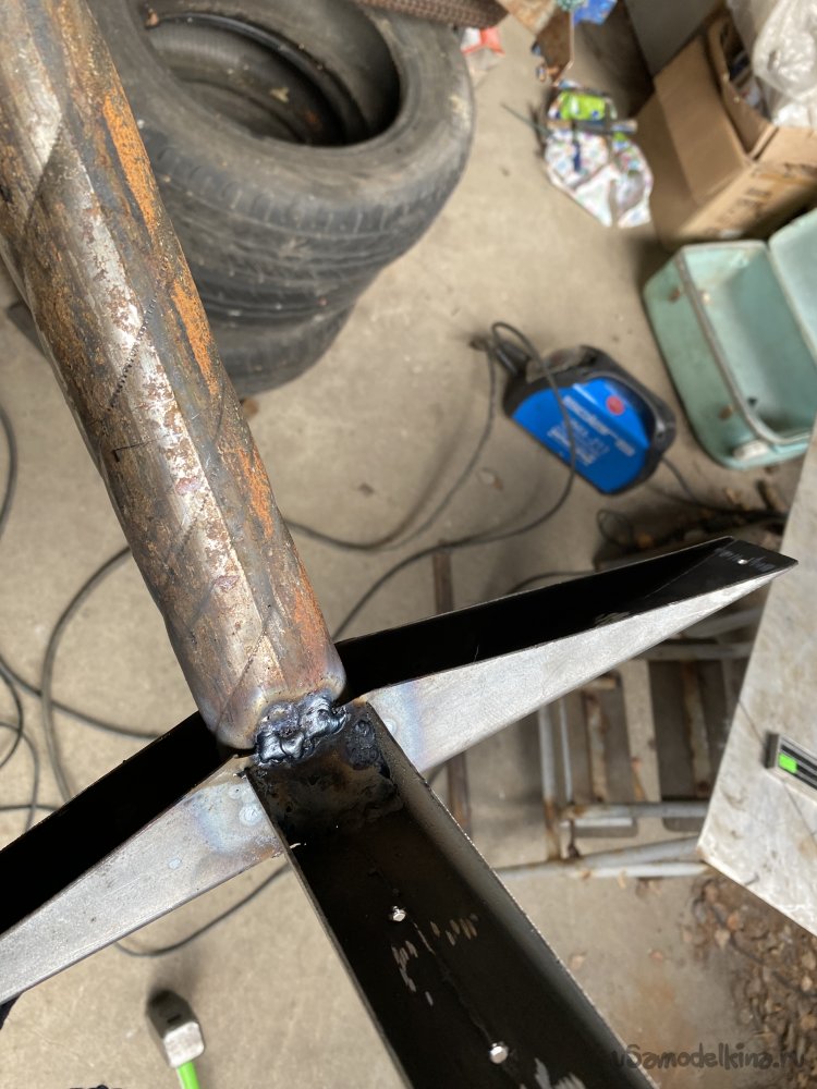 Вырезав перемычку, которую оставил только для более лёгкой сборки, положил её на пол, вставил в неё верхним торцом мою стойку и приварил. (опять помучавшись из за неравномерно тонкого металла)):