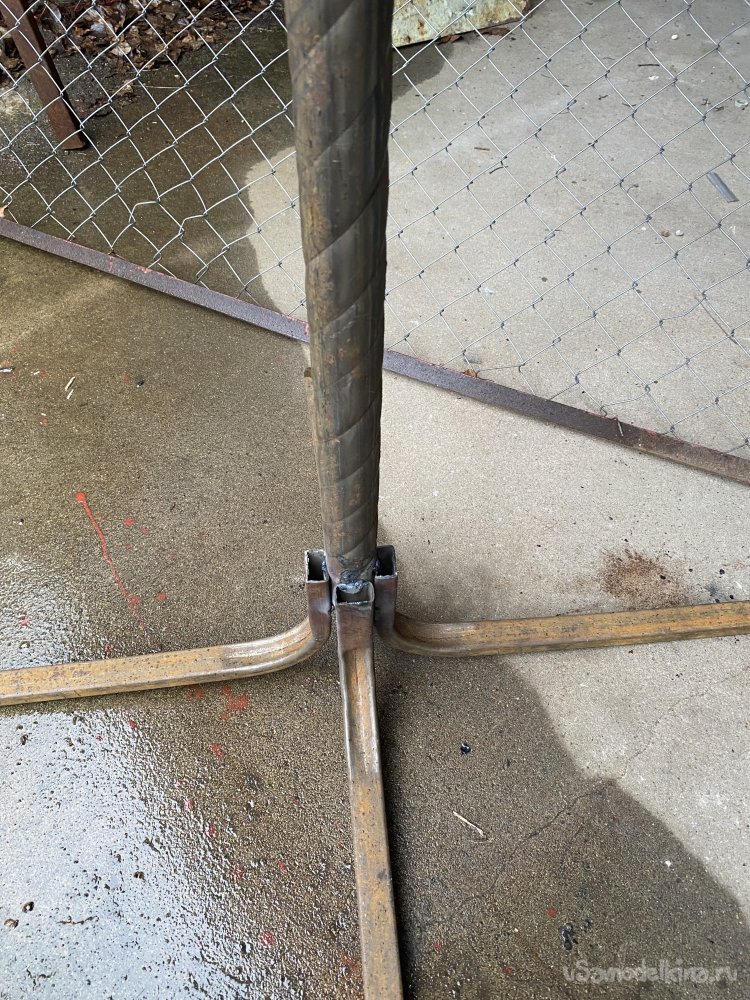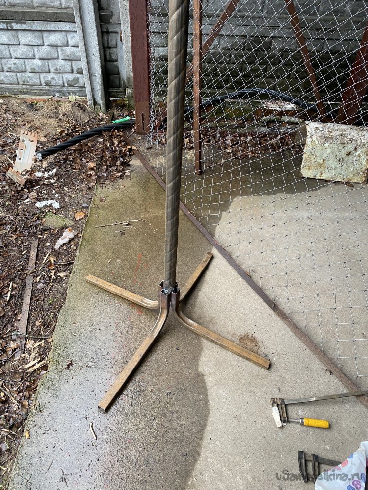 Стойка готова. Вооружившись уровнем, смог подогнуть её так, чтобы она, стоя на горизонтальной площадке, располагалась строго по вертикали. Просто наступал на одну из ног, и гнул стойку в обратную сторону. И так во всех плоскостях. Витая труба значительно жёстче "растопырок", поэтому, подгибались они.