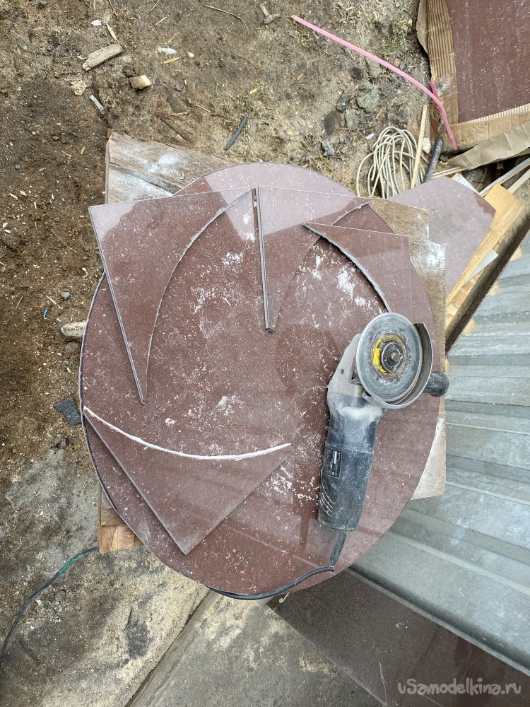 После чего вырезал круг болгаркой, используя алмазный круг. (Простите за тафтологию, но я, действительно, вырезал круг кругом. ))) Так называемым, "плиточным", который без радиальных разрезов и боковых "зубьев" на режущей кромке):