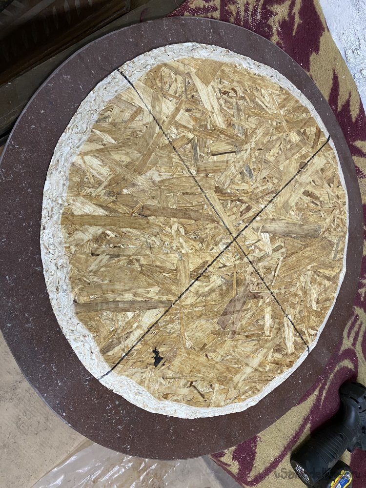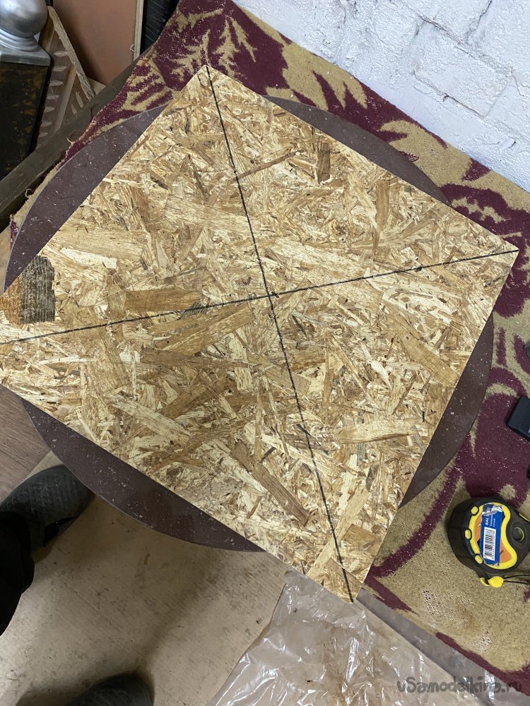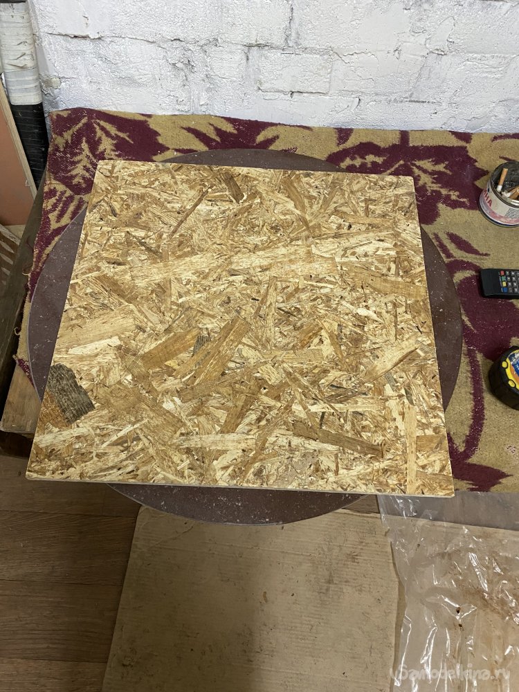 Как и в случае с этажеркой, я собираюсь сделать столешницу из ОСП с приклеенным на неё керамогранитом. Это даст возможность закрепить столешницу шурупами к металлическому основанию, и укрепить хрупкий керамогранит. У меня был квадрат ОСП толщиной 12 мм и размером 50х50 сантиметров (При изготовлении этажерки покупал лист, сразу с распилом (чтоб не было проблем с транспортировкой. Распилили мне его на четыре квадрата 50х50 и остаток. Использовал три, один остался.)