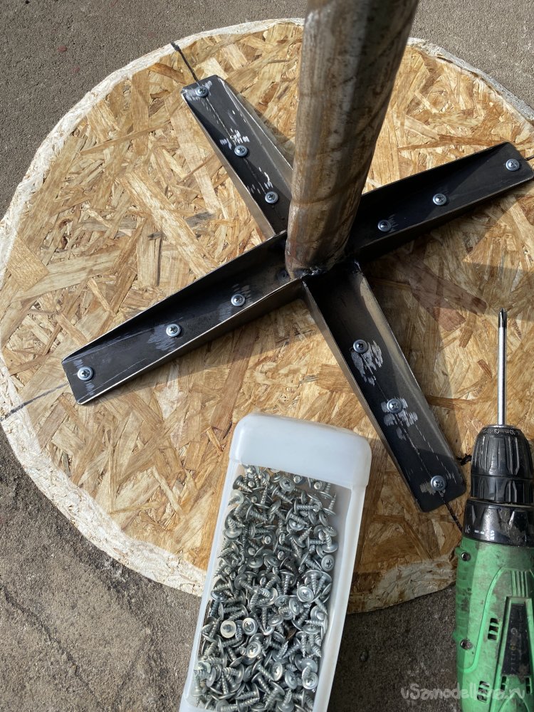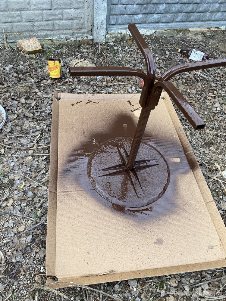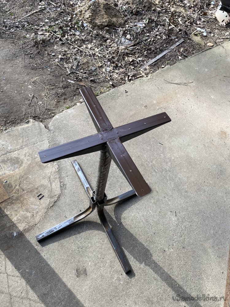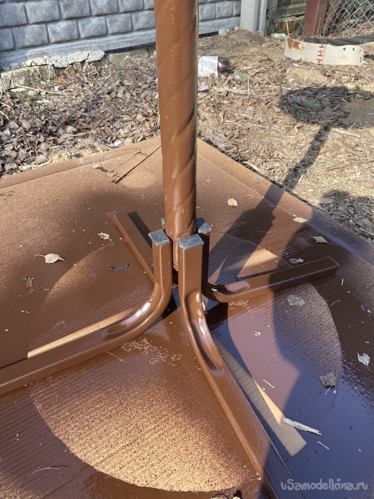 Основание готово. Можно собирать. Но, перед этим я покрасил из баллончика верх крестовины. Всю её покрашу после монтажа из краскопульта. При этом, эта плоскость, будучи прижатой к ОСП, осталась бы неокрашенной и потом, в сырости, оттуда бы вытекали ржавые потёки: