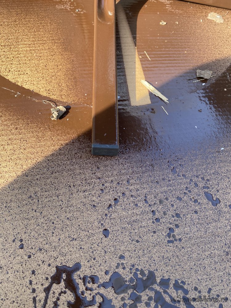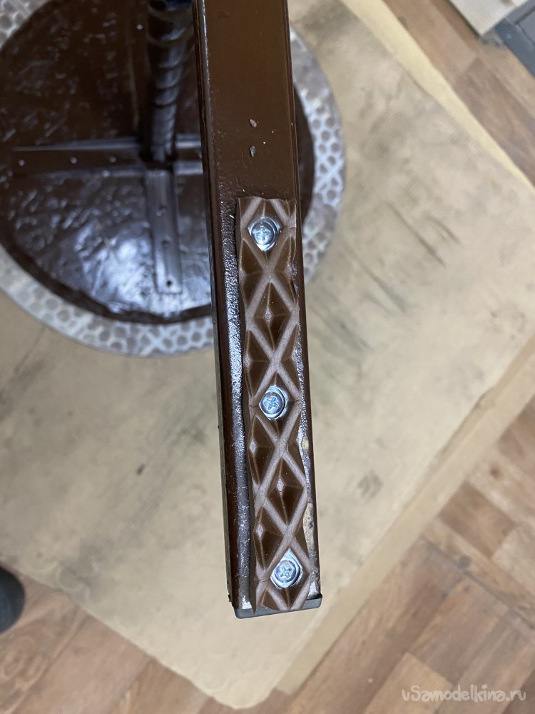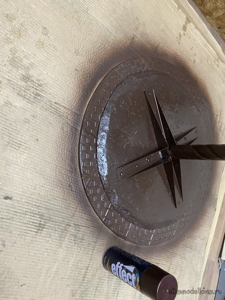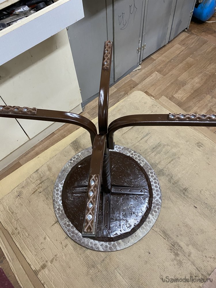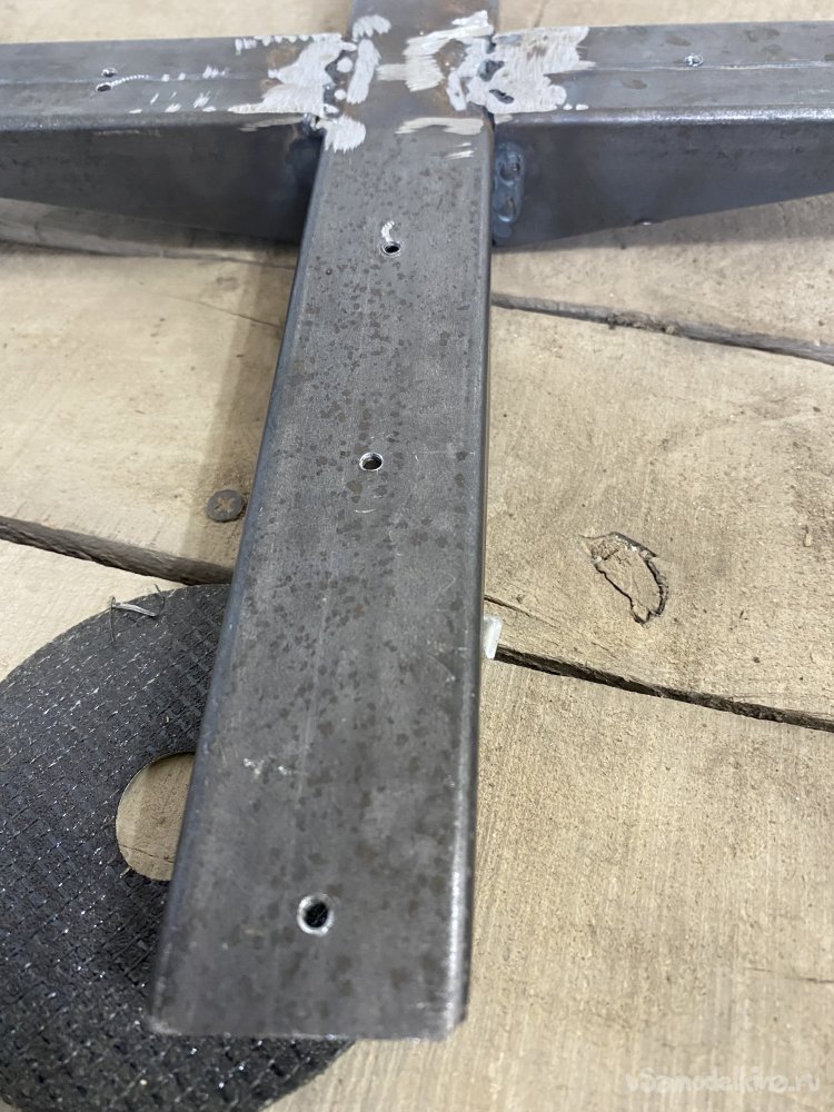 Основание готово. Можно собирать. Но, перед этим я покрасил из баллончика верх крестовины. Всю её покрашу после монтажа из краскопульта. При этом, эта плоскость, будучи прижатой к ОСП, осталась бы неокрашенной и потом, в сырости, оттуда бы вытекали ржавые потёки: