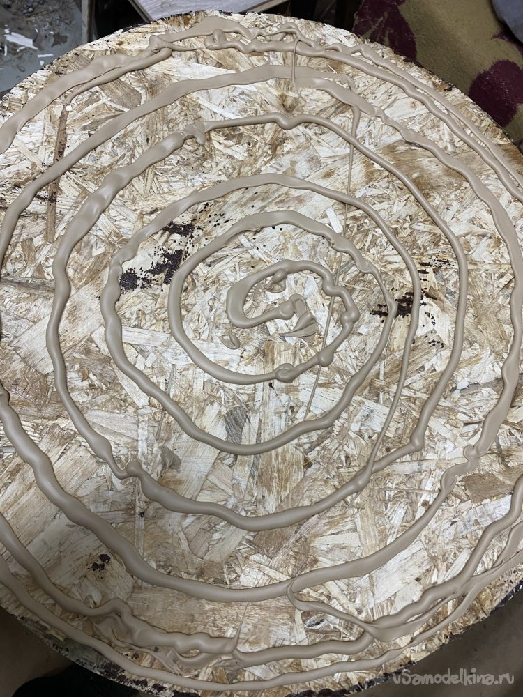 Круг из керамогранита положил на пол, а столик с нанесённым клеем перевернул и поставил на него. Так и выровнять проще, и прижим под весом, пусть и не очень большим, есть. А, пока сохнет клей, занялся ножками.