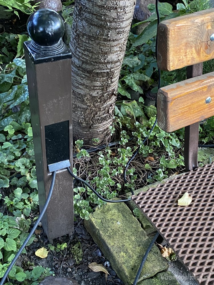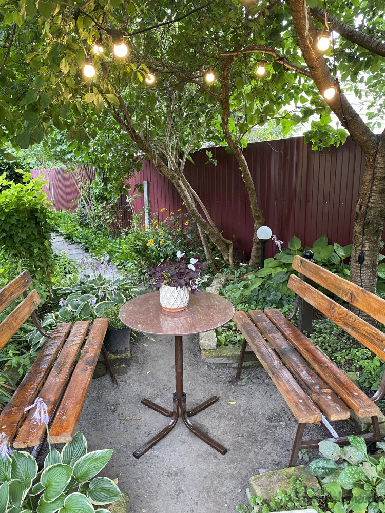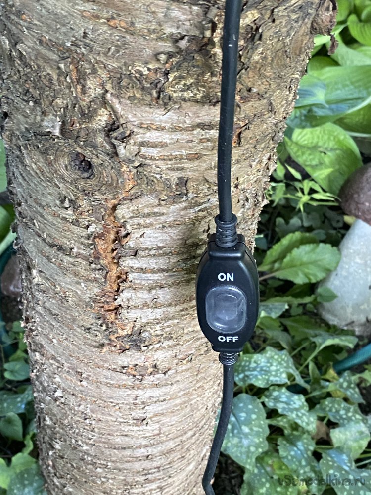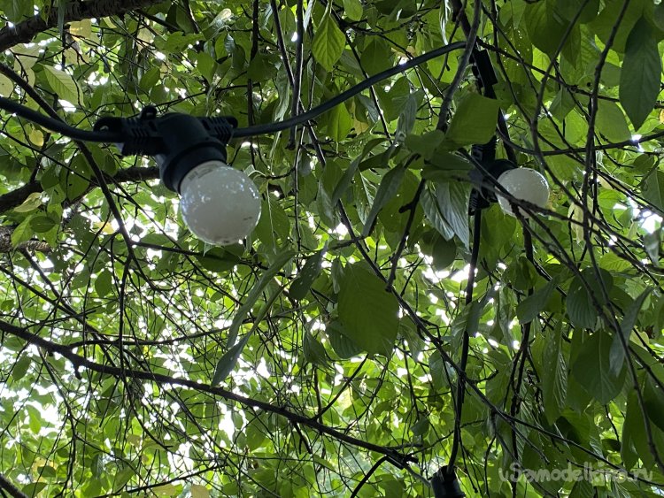 На ветвях вишни, под которой находится этот уголок отдыха, повесил гирлянду со степенью IP-65.