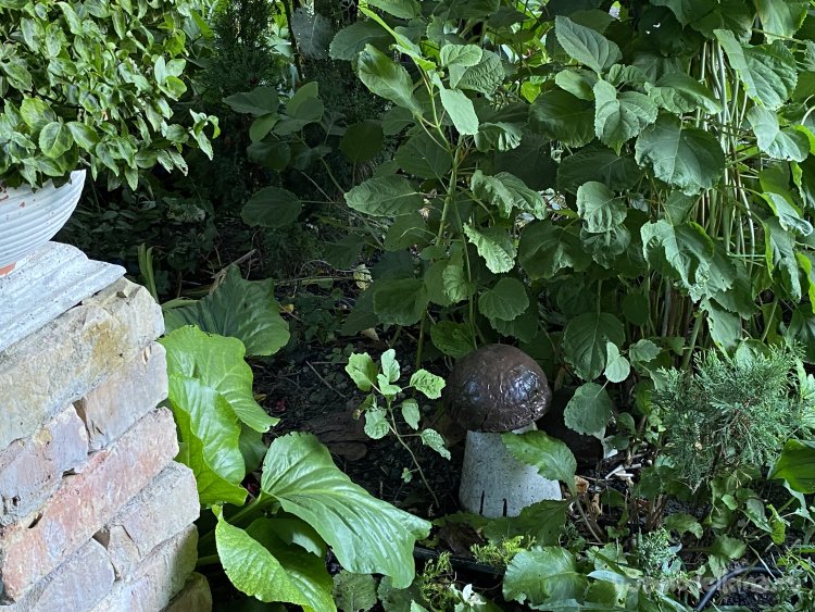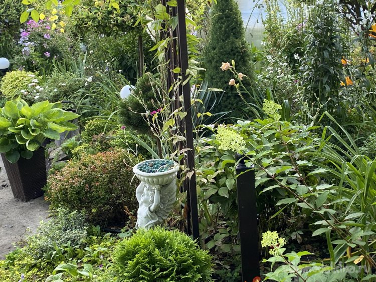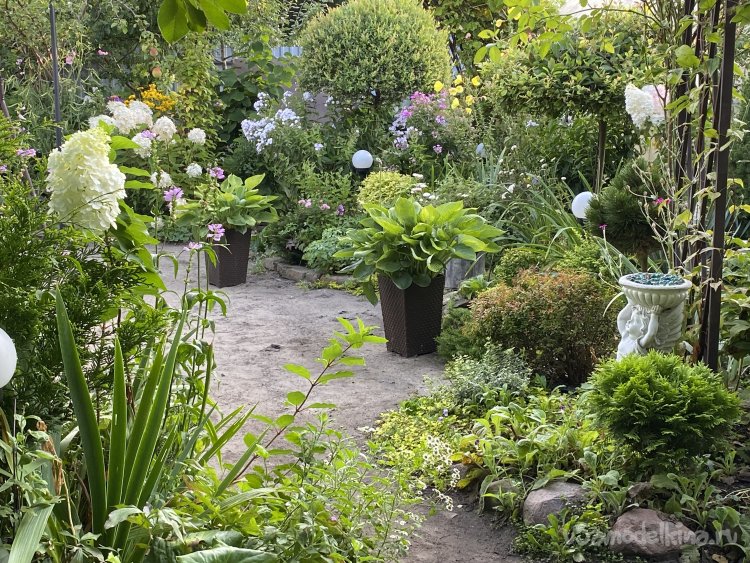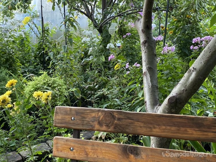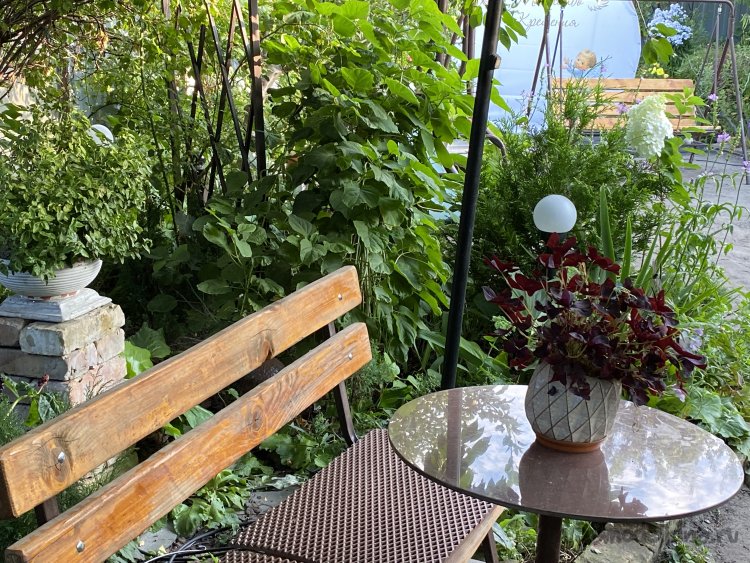 Самоделка полностью оправдала ожидания... Это моё любимое место отдыха под кофе и перекур. Очень приятно сидеть в теньке, глядя на цветы. Благодаря увлечению супруги, с этого места открываются вот такие виды...