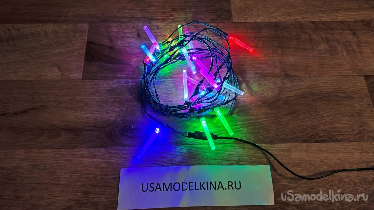Идея этой самодельной новогодней гирлянды родилась давно. И, раз приближается Новый Год, пора бы реализовать идею. Все началось с исследования рассеивания света RGB светодиодов со встроенными контроллерами переключения цвета различными элементами и материалами, включая и колпачки от медицинских шприцов, которые хорошо подходят к светодиодам по диаметру. Я ранее рассказывал об этом исследовании в одной из своих статей (ссылка). Колпачки можно добыть как от использованных шприцов, так и купить отдельно иглы с колпачками. Достоинство самоделки в том, что вместо колпачков можно использовать любые подходящие рассеиватели: кусочки термоклея, кусочки пластиковых труб, шарики от старых гирлянд и т.д. Для самодельной гирлянды нам понадобятся RGB светодиоды со встроенным контроллером (я использовал с медленным переключением цвета), токоограничивающие резисторы 47 Ом для питания светодиодов о пяти вольт, монтажный провод. В качестве монтажного провода изначально планировал применить удлинитель для гирлянд - прозрачный провод с вилкой и розеткой. По цене они были очень заманчивы, купил парочку. Именно с использованием такого прозрачного провода сейчас собирается подавляющее большинство гирлянд. Длина каждого удлинителя пять метров. Но потом в закромах нашел две старые ламповые гирлянды, у которых от старости стали рассыпаться пластиковые элементы держателей ламп. Жаль конечно, провода целые, лампы целые, а гирлянды придется выбросить в мусорку. Зачистил и сравнил провода двух гирлянд. Они оказались примерно одинаковыми. Можно добыть из гирлянды длинный провод и разрезать на нужные куски. Он как раз в цвет елки и вполне еще годится. Извлек провод из одной гирлянды, сложил его вдвое, получилось чуть больше 4 метров Поделил на количество имеющихся колпачков, получилось между светодиодами будет чуть менее 14 см. Это очень близко, поэтому выбрал расстояние между светодиодами 20 см. Кусачками делю провод на кусочки. В остатке кусочек 20 см. Отсыпал из пакетика некое количество светодиодов, даже не стал считать. Подготовил два цветных провода для начала гирлянды, чтобы потом не путать плюс и минус. От ленты, купленных на маркеплейсе резисторов, отрезал некое количество. Необходимо укоротить на резисторах ножки. Быстрее и проще всего это можно сделать большими ножницами. Кусачками аккуратно зачистил концы проводков. Жилки тонкие, надо действовать аккуратно. Теперь надо выработать некий алгоритм сборки, чтобы в процессе не перепутать полярность и сборка была не сложная. Проба сборки первого светодиода выглядит так. И, конечно, не терпится проверить его работу. Подключаю от блока питание 5 вольт. А так светит в полной темноте. Залудил остальные резисторы. Откусил ножки у светодиодов и тоже залудил. Алгоритм сборки получился очень простой. Первым делом на плюсовой провод, припаянный к резистору предыдущего светодиода, надеваем термоусадочную трубку. Скручиваем конец провода со следующим проводом, облуживаем скрутку и припаиваем к выводу предварительно облуженного резистора. Для удобства пайки я пользовался крокодилом, в который зажимал резистор. Далее, второй провод загибаем на резистор и, удерживая вместе резистор и провод одеваем, на них термоусадку. У меня термоусадка была немного маловатого диаметра, чем надо, туго одевалась. После оде