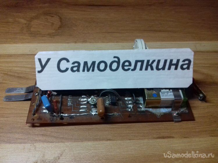 Здравствуйте, уважаемые Самоделкины! Живу в многоэтажном доме. Соседи с верхних этажей стали часто заливать то горячей, то холодной водой. Придумал, как собрать сигнализатор, который контролирует сразу три отдельных помещения (ванную, туалет и кухню). Собрал пока на макетной плате действующую, работающую модель. Вот схема сигнализатора. Описание работы схемы. Основой является микросхема D 1. Она представляет собой четыре логических элемента «И» с инверсией выхода. Хочу обратить ваше внимание на то, что она по логике работы и по цоколёвке полностью соответствует широко известной микросхеме К561ЛА7. Отличие в том, что у ЛА7 на входах отсутствуют триггеры Шмитта, поэтому в данной схеме работать она не будет. Элемент D 1.1 является главным в обнаружении утечки воды. В отсутствие утечки вывод 2 микросхемы через резистор R 1 соединён с общим проводом и на нём лог. ноль, генератор, собранный на этом элементе выключен. При попадании даже небольшого количества воды на контакты XS 1 и XS 2 между ними возникает проводимость. На выводе 2 появляется напряжение, и если оно достигает определённого порога, генератор включается. Тоже самое произойдёт, если протечка возникнет в других помещениях, в которых установлены дополнительные датчики. Они посредством двух проводной линии подключены к сигнализатору через разъём XS 3. Конденсатор C 1 устраняет сетевые и прочие наводки на вход сигнализатора. Частота генератора задаётся элементами C 2 и R 2 и составляет примерно 1Гц. Эти импульсы через элемент D 1.2 включают и выключают генератор звука, собранный на элементе D 1.3.Такой режим увеличивает слышимость сигнала тревоги. Элемент D 1.2 является инвертором и нужен для правильного управления элементом D 1.3 На элементе D 1.3 собран генератор звукового сигнала, нагрузкой которого служит пьезо излучатель BZ 1. Частота генератора задаётся элементами C 3 и R 3. Подстроечным резистором R 3 она подгоняется под резонансную частоту излучателя для получения максимальной громкости звука. Резонансных частот обычно несколько и такая регулировка позволяет настроиться на самую громкую, слышимую. Элемент D 1.4 является инвертором и за счёт соответствующего включения излучателя позволяет дополнительно повысить громкость. Цепь питания состоит из выключателя SA 1, диода VD 1 и конденсатора C 4. Диод служит для защиты от переплюсовки батареи, выбран с малым падением напряжения. Конденсатор обеспечивает стабильную работу сигнализатора при увеличении внутреннего сопротивления батареи в ходе её длительной эксплуатации. Изготовление сигнализатора. Детали и материалы: Микросхема IW 4093 (К561ТЛ1), диод Д310, конденсаторы (плёночные) 0,22мкФ,0,68мкФ,0,1мкФ,резисторы 9,1МОМ,1,1МОМ,47кОм (подстроечный), пьезо излучатель (с резонатором), колодка под батарею «Крона», разъём, пружинистые контакты с анти коррозийным покрытием - 2шт.,выключатель, монтажная плата, монтажный провод, припой, канифоль, термоклей. Приборы и инструменты: Мультиметр, паяльник, термопистолет, кусачки, пинцет, канцелярский нож. Сборка сигнализатора заключалась в распайке деталей на монтажной плате согласно предварительной схеме. Затем проверка в работе, в процессе которой пришлось подкорректировать номиналы некоторых элементов. Так выглядит датчик протечки самого сигнализатора. Это пружинистые пластины, изогнутые таким образом, чтобы под весо