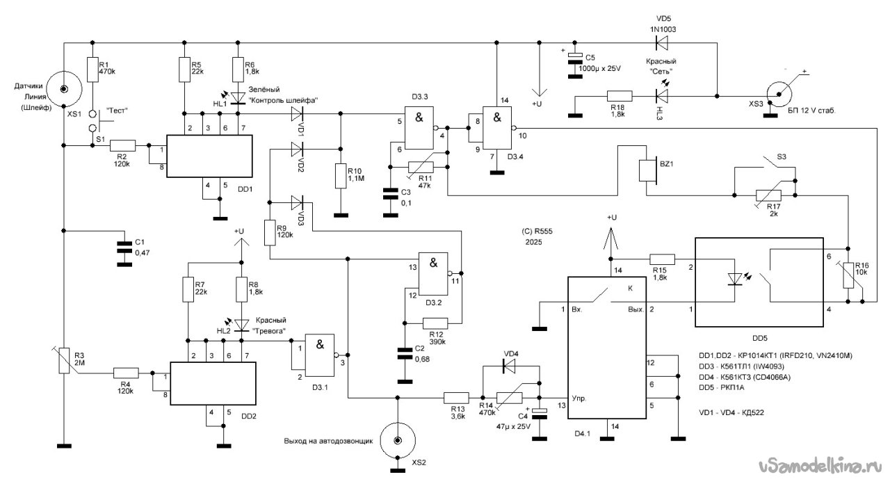 Микросхемы DD1 и DD2 выполняют роль компараторов напряжения. Их точность невелика, но достаточна для данного применения. Порог срабатывания первого (DD1) не регулируется. Напряжение переключения составляет порядка двух Вольт. Порог переключения второго регулируется подстроечным резистором R3 и устанавливается величиной примерно 4,5 В. Резисторы R2 и R4 предотвращают от выхода из строя защитный стабилитрон на входе микросхемы при попадании на него Uпит. при замыкании шлейфа.