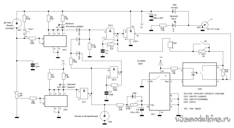 Разъём XS2 – это выход на автодозвонщик. Он соединён с выходом элемента D3.1. В дежурном режиме на нём ноль Вольт, в режиме тревоги – Uпит. Появление этого напряжения является сигналом для запуска автодозвонщика, который согласно его программе звонит на заданный номер (номера).