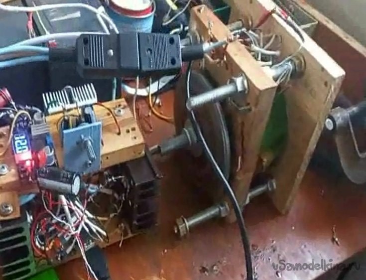 И снова я пробую собрать электрический двигатель, который по мощности должен превышать ранее сконструированные. https://vk.com/id232715610?z=video232715610_456239043%2Fvideos232715610%2Fpl_232715610_-2 https://rutube.ru/video/54297819cb60b92e3de8fb8ef44ac43b/ Для этого по закромам наскреб двадцать четыре магнита диаметром одиннадцать миллиметров, высотой девять, ну, да, глубоко б/у, надбитые, ржавые, но не потерявшие свои магнитные свойства. А еще, в тех же закромах, попался мне металлический диск, толщиной в десять миллиметров, диаметром сто тридцать миллиметров. Разложил на нем магниты, все прекрасно разместились, нашел середину диска, просверлил отверстие двенадцать миллиметров под вал. В прошлой конструкции двигатель имел всего восемь магнитных полей на якоре, теперь будет двадцать четыре. Вал не стал делать из болта как в последнем моторе, а решил выточить его из металла. На нем, с одного конца, проточил посадку под металлический диск, потом под два подшипника и удлиненную часть под шестерню бендикса с гайкой. В металлическом диске, отступил от края, просверлил лунки, глубиной четыре миллиметра под магниты. Вклеивал их так, через одно отверстие наружу южным полюсом, оставшиеся, наружу северным полюсом. Собирал якорь используя бугеля от какого то механизма, между бугелями вложил вставку из фанеры в которой имеется отверстие меньше диаметра используемых подшипников. При затягивании гайки вала, подшипники упираются обоймой в фанеру и не двигаются внутри бугелей. На вал одел подготовленную шестерню бендикса, затянутая гайка не дает гарантии жесткого крепления шестерни, при нагрузке будет пробуксовка. Нужно было придумать, что то подобие шпонки. Эту проблему решил так. В станок для сверления я закрепил в патроне сверло с победитовой пластиной. Простое сверло, закаленное тело шестерни даже не поцарапало. На небольших оборотах с добавлением воды победит на сверле, хоть и немного рассыпался, но просверл плотный металл. Осталось подобать шпонку в виде цилиндра и после того как она займет свое место в подготовленном отверстии, то ли одену плотное кольцо закрывающее шпонку, то ли прихвачу сваркой. В случае необходимости замены шестерни, место сварки просто нужно будет подточить пока не освободится шпоночное отверстие. С валом можно сказать все закончено, бугеля между собой затянул болтами. При вращении вала биение отсутствует, чего не наблюдал на валу из болта на прошлом двигателе. Ах да, металлический диск с магнитами, чтобы не делать шпоночную фиксацию, просто приварил. Второй этап сборки двигателя это сборка статора. Нарезал из трансформаторного железа толщиной ноль пять миллиметра сердечники сечением десять на десять миллиметров и длинной шесть сантиметров в количестве восемнадцать штук. Из фанеры толщиной восемь миллиметров вырезал заготовку по размерам фанерного вкладыша, который находится между бугелями. Нарисовал окружность, там где будут вращаться магниты, лобзиком выпилил квадраты под сердечники. Сами отверстия подровнял и вклеил сердечники на смолу. Когда смола стала, сердечники обвернул бумагой. Для обмотки использовал эмалированный провод ноль пять миллиметров собранный в жилу из семи проводов. В каждой фазе у меня шесть сердечников, на каждом из которых намотал по сорок витков. Длинна жилы на каждой фазе примерно девяносто метров. Соединил якорь с ротором тремя болтами, 