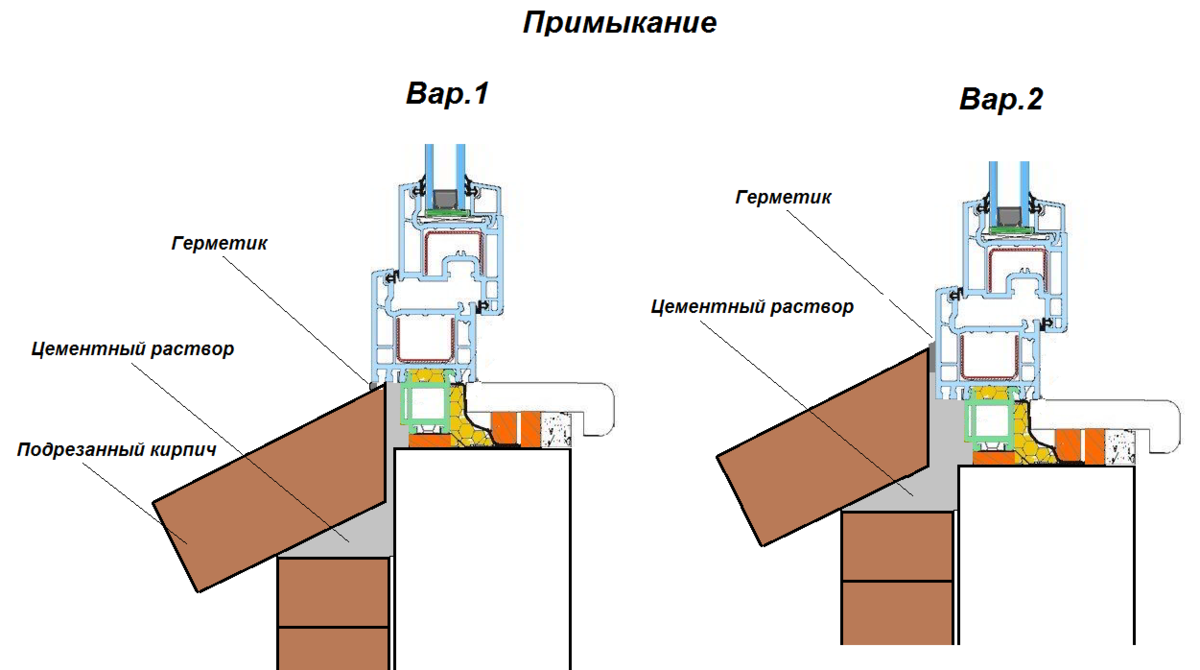 В случае "ПОСЛЕ окна" отлив можно будет завести под ПВХ профиль в те места, где как раз прикручивается и металлический отлив (Вар.1 на рисунке), а в случае "ДО окна", отлив будет примыкать к ПВХ раме и это примыкание нужно забивать герметиком (Вар.2 на рисунке), выглядят оба способа так: