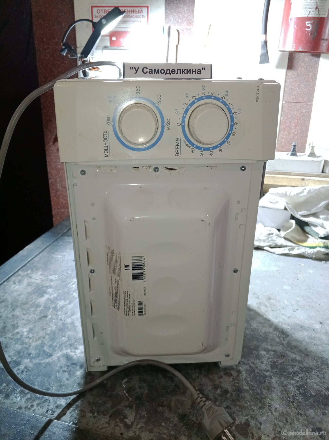 Доброго Всем времени суток! Продолжаю мои проекты, из серии «Вторая жизнь» старых вещей. Началось все с разговоров, что когда то, кто-то при помощи бытовой микроволновой печки боролся с жуками древоточцами, прислонив ее включенную, с открытой дверкой к деревяшке и произошло «чудо», жуки якобы пропали, а может и «поджарились». Теоретически, такой принцип борьбы имел место быть, так как вода есть практически везде, а предназначение микроволновки , как раз разогревать водосодержащие вещества. Вот и «промелькнула» у меня мысля, применить это «направление», для борьбы с садовыми муравьями. Насмотревшись видео и начитавшись материала в интернете, еще более захотел сделать себе этакую «приблуду», из старых микроволновок – доноров. Сомнения были, так как «лагерь» авторов нетовских материалов, был разделен на за и против, ну, как всегда, у каждого свое мнение, образование и опыт. Захотел и я получить свой личный опыт, в создании СВЧ «пушки». Конструктив «пушки» будет создаваться по ходу работы. Переходим в творческую мастерскую. Материалы и инструменты: Материалы: Печь микроволновая БУ. Инструменты: Бокорезы. Отвертка +-. Паяльник с принадлежностями. Плоскогубцы. Стриппер. УШМ. ШАГ 1 Разборка. Давно валялась сгоревшая микроволновка, причины ее поломки были визуально видны и разбирать я ее стал не задумываясь, а не включать в розетку и смотреть что будет, вскрытие покажет. Еще имелись запчасти от другой микроволновки, уже разобранной. Разборку расписывать не буду, все логически понятно, единственное, для ускорения, банально спилил УШМкой петли дверцы и отрезал кусок задней внешней стенки, оставив часть, на которую крепится электрическое «нутро». Так, тихонько разбирая, я добрался до магнетрона . Даа, подустал «пациент», колпачок волновод выгорел от пробитой дуги. Не стал я пока экспериментировать с включенным магнетроном без защитного колпачка (пишут что если совсем рядом с собой это сделать, глазам будет совсем нехорошо ) , а заменил на другой рабочий. По мощности указанных в ТТХ трансформатора и магнетрона , они подходили друг к другу. Далее демонтировал «концевики», замыкающие электроцепь, при закрывании дверки микроволновки, а из проводов сделал скрутки напрямую. ШАГ 2 Пробное включение и доработка электросхемы. Установил на штатное место магнетрон. Пробное включение. КЗ не было и уже хорошо, магнетрон с трансом «загудели», а освещение, вентилятор и моторчик для поворота тарелки «признаков жизни не подавали». При помощи люминесцентной лампы, определил, что магнетрон волны выдает. Где-то наверно «перемудрил» с проводами. Еще раз «прошелся» по проводке, убрал лишнее, в том числе провода на моторчик тарелки, сделал новые технологические скрутки, проверяя работоспособность на «донорах». Включение – гудит, крутится и светит. Выявил следующую неисправность – не работает моторчик, часового механизма таймера. Моторчик «донор» в помощь. ФОТО 38 Для наглядности на графике, постарался изобразить работу микроволновки при нагреве пищи и разводку проводов блока управления, может кому пригодится. Магнетрон работает во временном цикле с перерывами, при одной и той же мощности. Решил протереть «жирную» лампочку, дай думаю выкручу и «свернул ей башку»…. Если кто будет менять лампочки в микроволновках, учитывайте, что они разного исполнения, с цокол