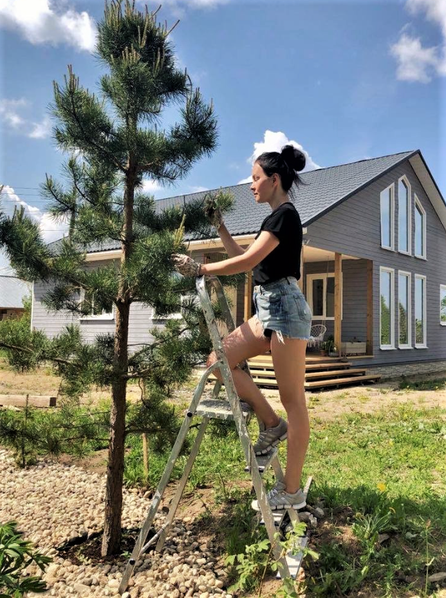 Одно из главных украшений данного участка, являются большие сосны, которые уже росли здесь на момент покупки. Так как этих деревьев было не особо много, хозяйка решила посадить еще несколько сосен.