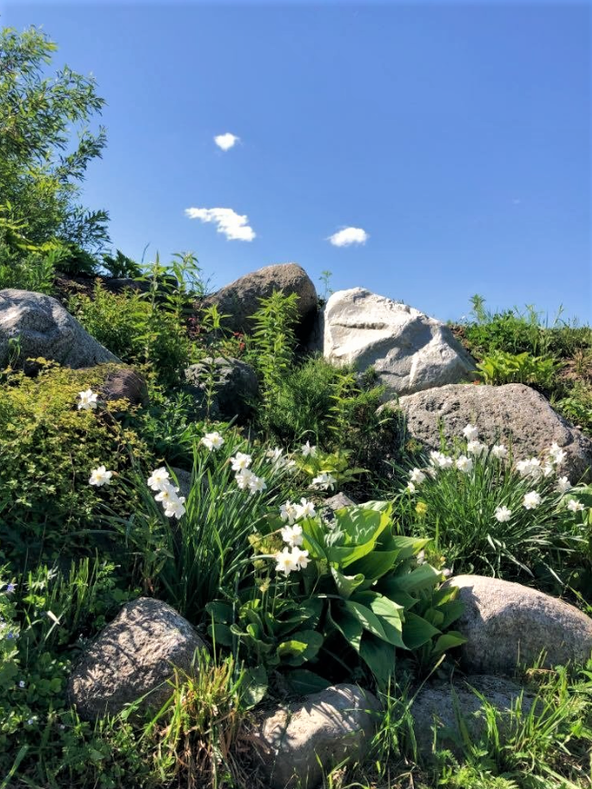 Изначально, участок был неровным и весь заросшим. Поэтому в первое время всё выравнивали и корчевали. Так же бы нанят бульдозер, который вытащил из-под земли несколько больших валунов и сгреб их в одну кучу — это и было началом создания альпийской горки. Далее валуны начали понемногу обрастать и хозяйка подсаживала к ним разные растения, так получилось то, что вы можете наблюдать на фото.