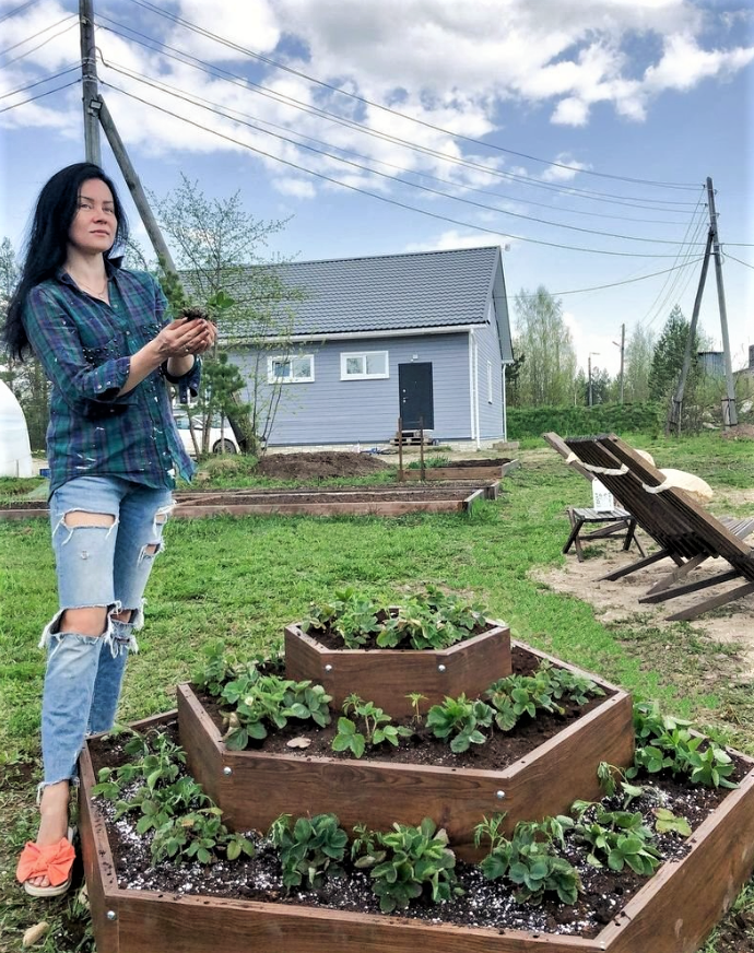 Так же на участке появилась клумба из нескольких уровней, о которой давно мечтала хозяйка. Эту клумбу она заказала в интернет магазине за 3000 рублей и сама её быстро собрала. Сюда она высадила клубнику и землянику. Так же дополнила клумбу бархатцами.