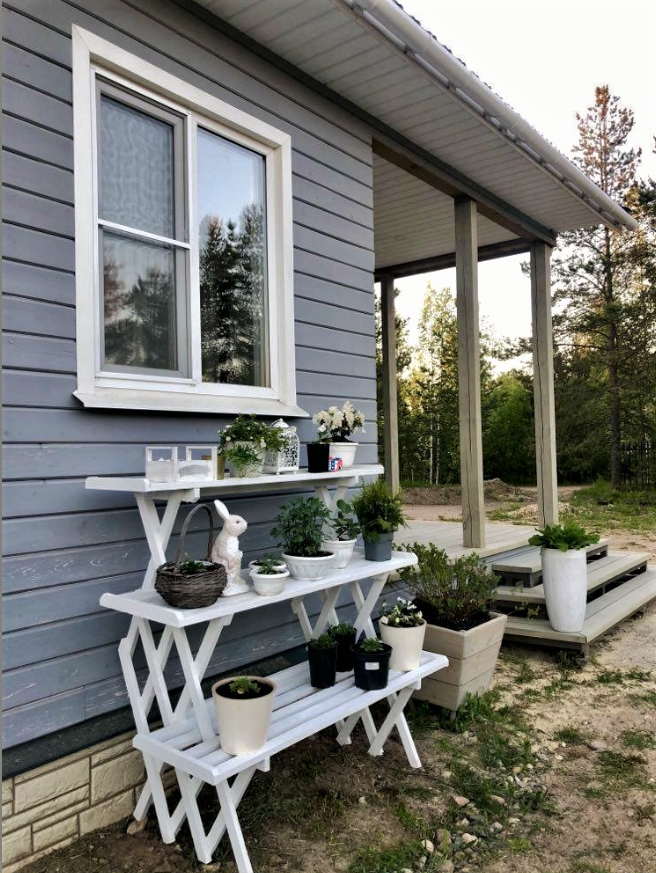 Возле дома появилась этажерка с цветами, которую смастерил муж хозяйки.