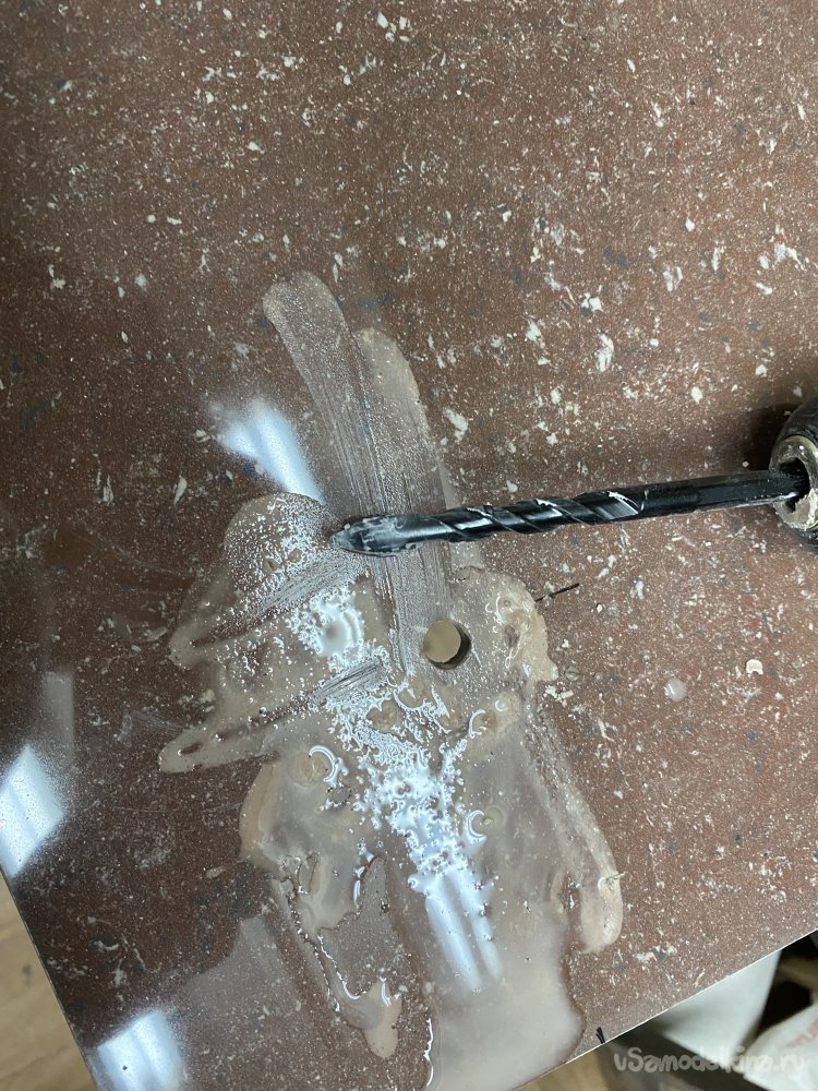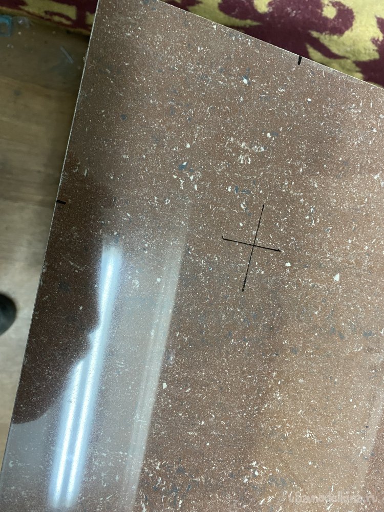 Отступил по 10 см с каждой стороны, разметил и просверлил в углах двух плиток отверстия, диаметром 12 миллиметров, используя сверло по стеклу и керамике: