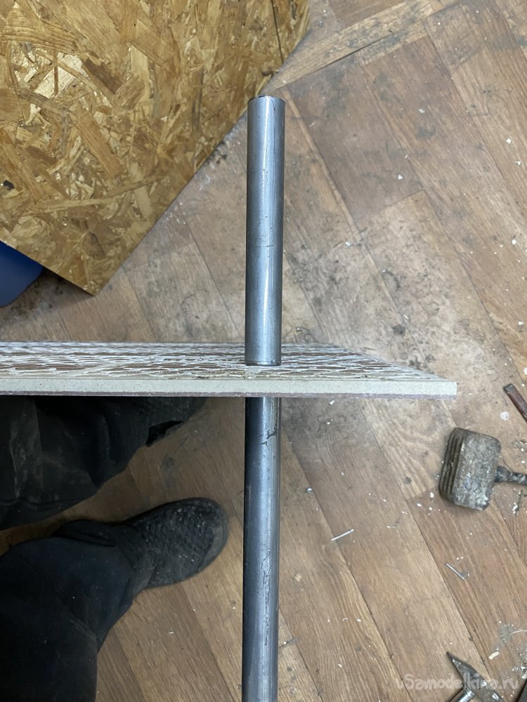 Положив их на плитки (при этом края плитки выступают на 5 см), просверлил отверстия напротив тех, что в плитке, но сверлом на этот раз, 10 мм, а не 12, как в плитке: