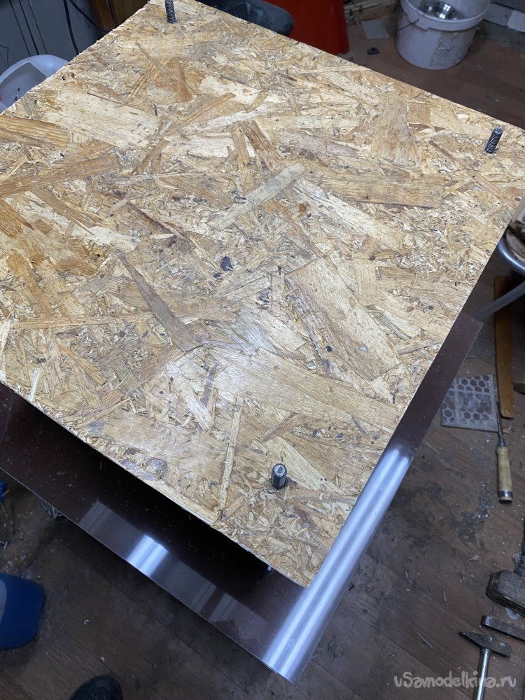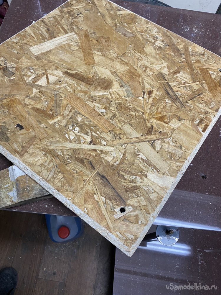 Для того, чтобы сделать конструкцию крепче, я решил использовать плиту ОСП. Из такой плиты, толщиной 12 мм, я вырезал три квадрата со стороной 50 сантиметров.