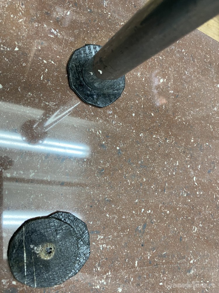 Но делать так нельзя! Керамогранит - очень твёрдый материал, но, в то-же время, он хрупкий! Если так собрать, он треснет от малейшего перекоса! Я даже отверстия сверлил 12 мм, а не 10, как толщина шпилек, потому, что у металла высокий коэффициент теплового расширения, и, если не дать болту место для расширения, на летнем солнцепёке он вполне способен расколоть плитку.