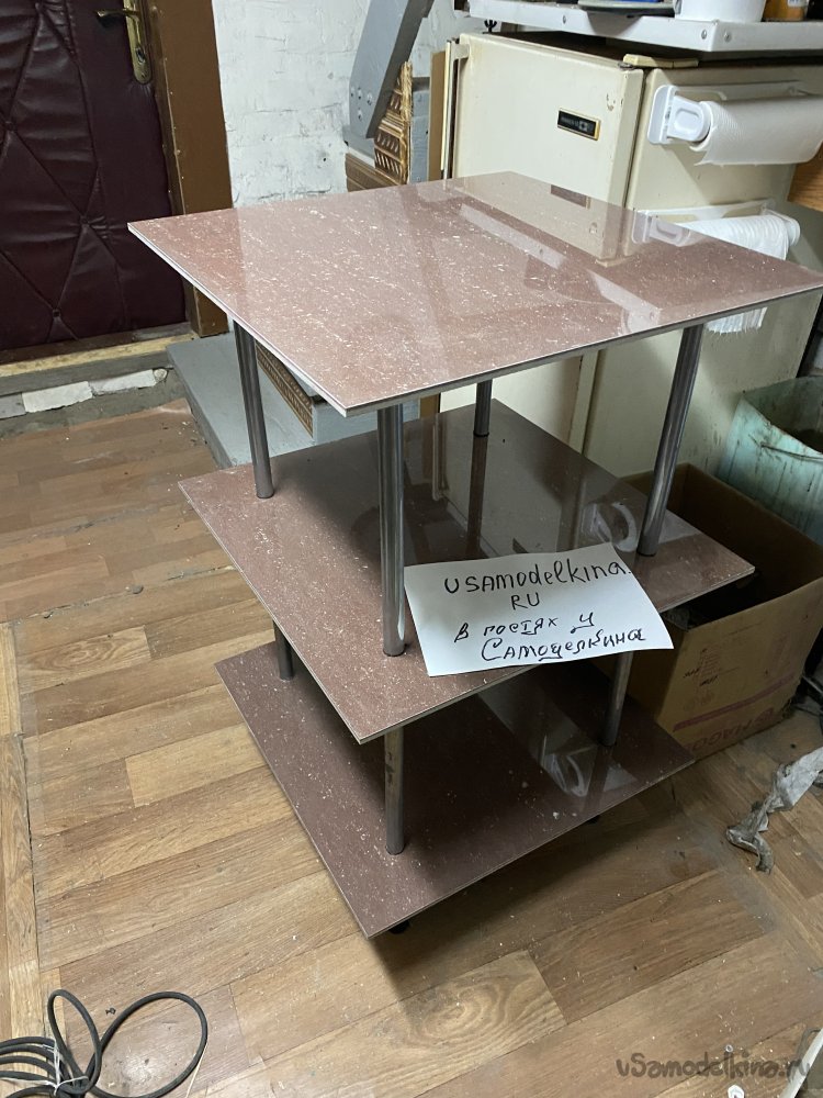 Собрал две полки. Третью, последнюю, решил крепить только на клей. Ведь, будет не красиво и не практично, если на верхней площадке будут торчать четыре гайки. Можно, конечно, купить хромированные, или нержавеечные колпачковые гайки.... Но, лучше, всё-токи, будет без них! Поэтому, последнюю деревянную площадку закрепил к фланцам шурупами, а торчащие из отверстий концы шпилек срезал: