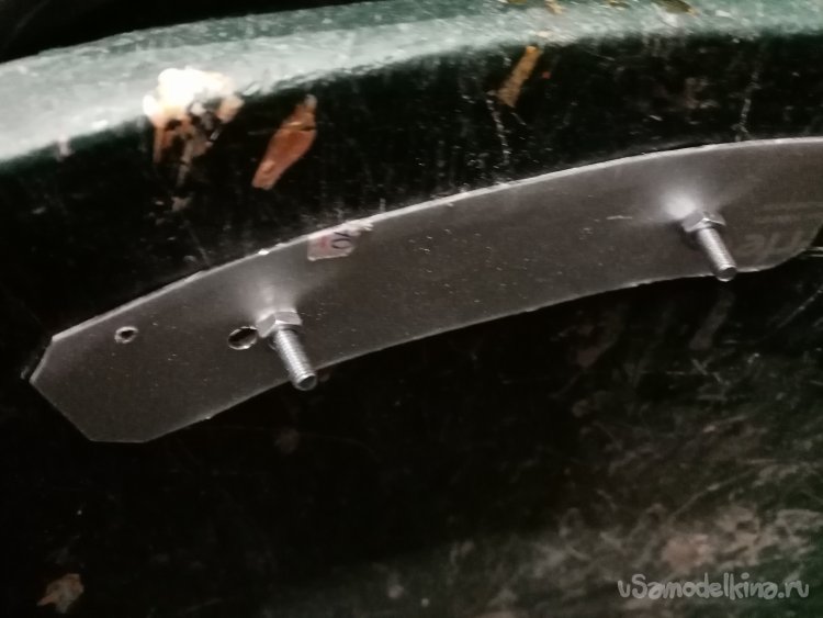 Сверление отверстий в стенке бака происходит по стандарту. Сначала складываю все детали вместе. Усиливающую пластину с внешней стороны крепления ручки, прикладываю к краю бака и сверлю отверстие. Вставляю болтик, с внутренней стороны закрепляю вторую усиливающую пластину и фиксирую гайкой. Затем сверлю второе отверстие и фиксирую. Затем окончательно закручиваю болтики.