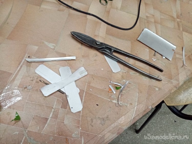 Нужны усиливающие накладки. Еще одни поиски по углам и закоулкам увенчались успехом. Нашел алюминиевую крышку от ноутбука. Материал прочный и толстый 1,5 мм. Разметив нужные детали отрезаю простыми советскими ножницами по металлу. Длинные ручки позволяют совершенно без усилий резать достаточно толстый материал. Плюс небольшая модернизация и хорошая заточка данного инструмента позволяют с легкостью резать бумагу, даже швейные нитки.