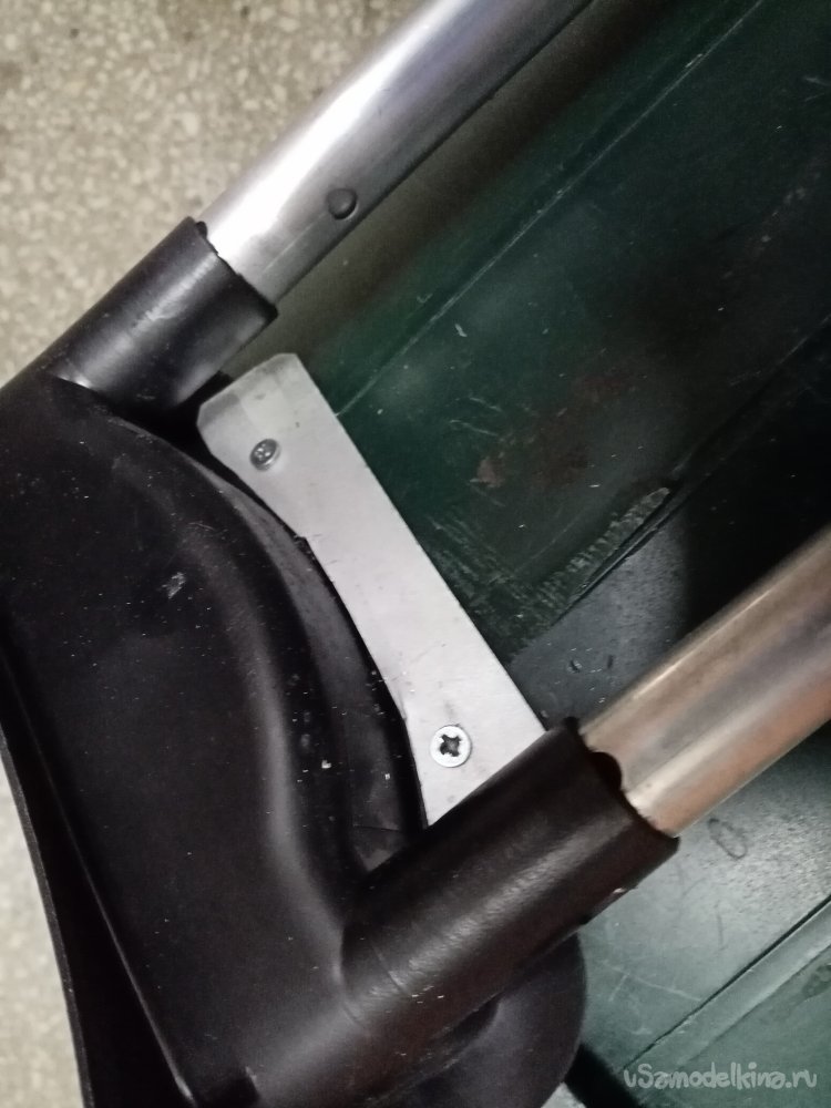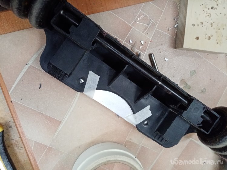 На пластике верхнего крепления ручки остались отверстие от заклепок. Очень даже хорошо. Размечаю места сверления на алюминиевых пластинах под этот размер.
