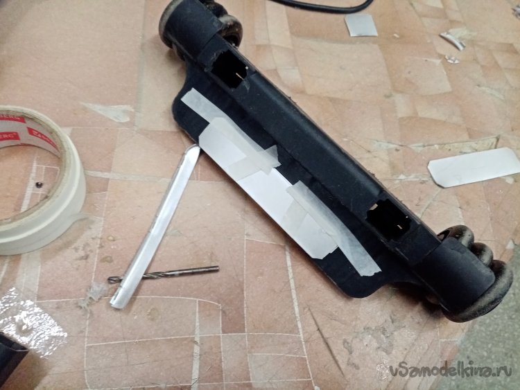 Вырезаю из остатков алюминиевой крышки от ноутбука усиливающую накладку. Нужно просверлить отверстия в колесиках и накладке. Желательно одновременно. Закрепляю алюминий на блоке колесиков при помощи малярного скотча.