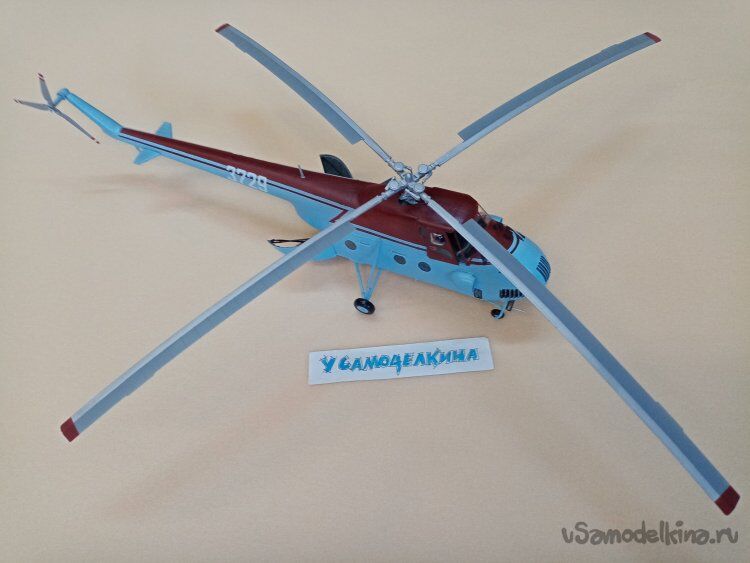 Решил помочь собрать вертолет МИ-4 в достаточно большом масштабе. Никогда не приходилось создавать такую большую модель. С фирмой «Trumpeter» тоже не приходилось встречаться. И так у меня большая коробочка с литниковыми рамками внутри. Достаточно подробная инструкция варианты раскраски. Но мне они не пригодятся. Есть предложение гражданской ливрее. Были предложены образцы раскраски. По ним и буду работать. И декали приложены достаточно хорошие. Но не подойдут из них нужны только цифры. Желательно бы еще надпись «аэрофлот», но не нашел в нужном масштабе. Только 1:144 слишком маленький размер. Осматриваю литниковые рамки. Качественное исполнение. Облоя катастрофически мало. Тешу себя надеждой, что мало придется строгать и подгонять. После ознакомления с инструкцией и литниками нужно продолжать. Начинаю сборку. Первое дело промываю все рамки в теплой воде с «Фери». Нужно смыть жир и грязь с деталей. Иначе будет плохо ложиться краска. И желательно руками поменьше брать за поверхности. Осторожно работаю широким и мягким флейцем. Внимательно слежу, чтобы не отломить маленькие детали. В этом наборе есть тонкость. Небольшие детали закреплены на рамках, как правило, тремя прутиками. Хорошо и плохо. Прочно. Но придется аккуратно отрезать и зачищать места отреза. После банных процедур обсушиваю воду на полотенце, окончательно на батарее. Благо зима на дворе все теплое и даже горячее. Подготовительные работы окончены. Можно приступать к сборке. Пришла идея, по возможности окрасить детали на рамках. Несколько причин. Удобно контролировать маленькие детали. Использовать одну зарядку аэрографа одной краской по всем нужным деталям. Сверхтекучий клей практически не оставляет следов на окрашенной поверхности. Проблемные места можно подкрасить после полной сборки. Думаю предложенный способ значительно сократит время сборки и улучшит качество. Такие теоретические рассуждения. Есть достаточное количество краски от ТАМИИ и других производителей. А также альбом от ТАМИИ где указана палитра красок. Поможет смешать нужные оттенки, если придется подгонять цвет. Первый вариант «авиационного» голубого немного не попадает. Смешал парочку цветов. Немного осталось голубого и белого. Намешал прямо в баночке. Немного, но думаю, хватит. Окрашиваю голубым все нужные детали на два раза. Простой китайский аэрограф и бесшумный компрессор в деле. Затем немного серого цвета на все внутренние поверхности кабины. В этом варианте окраска сильно разнится. Есть голубой, белый, зеленый интерьер. И серый тоже. Немного подкорректировал морской шаровый в сторону осветления. Работаю от светлого к темному. Поэтому не нужно особо тщательно промывать аэрограф. Перехожу к черному. Приборная доска, кресла пилотов, колеса шасси. Матовая от тамии самое то в интерьере. Где нужно отбить границу прикрываю полоской канцелярской бумаги с липучкой. К стати хороший вариант для всякой мелочи. Клеится и отклеивается хорошо, не оставляет следов. Металлические диски колес уже окрашены голубым авиационным. Нужно шины черным задуть. Меряю размер кружочков. На малярном скотче циркулем черчу нужный размер. Вырезаю треугольным ножом для творчества. Споткнулся о рабочиц мат. На поверхности нарисованы кружочки как раз нужного мне диаметра. Не догадался. Тем более что наклеив сверху скотч, эта 