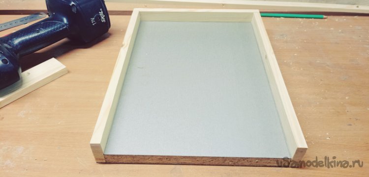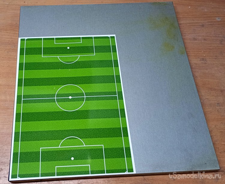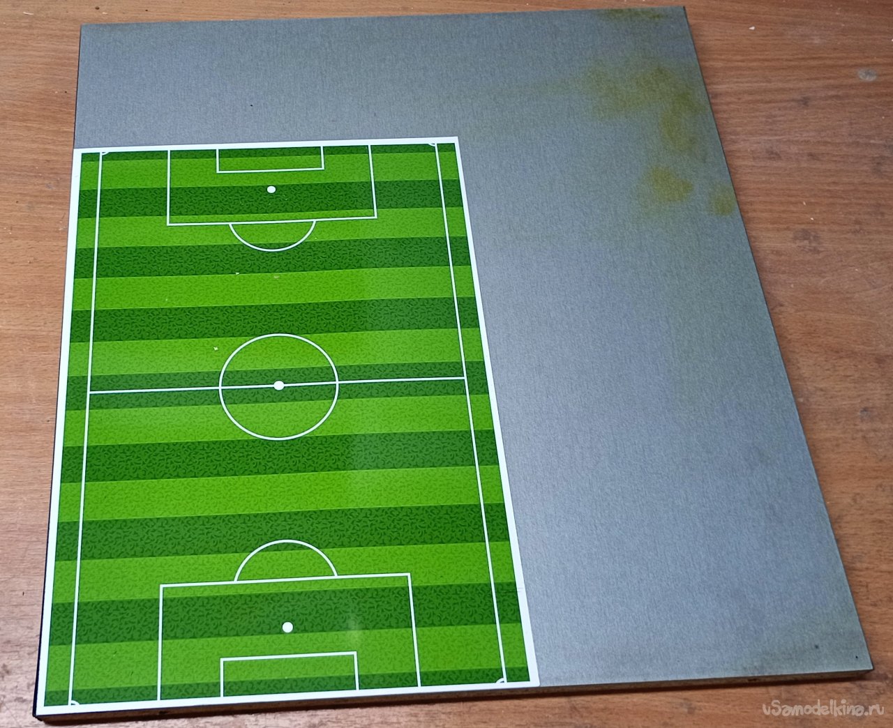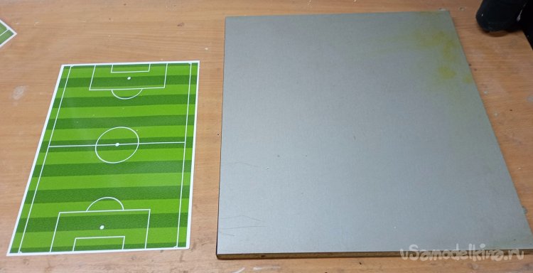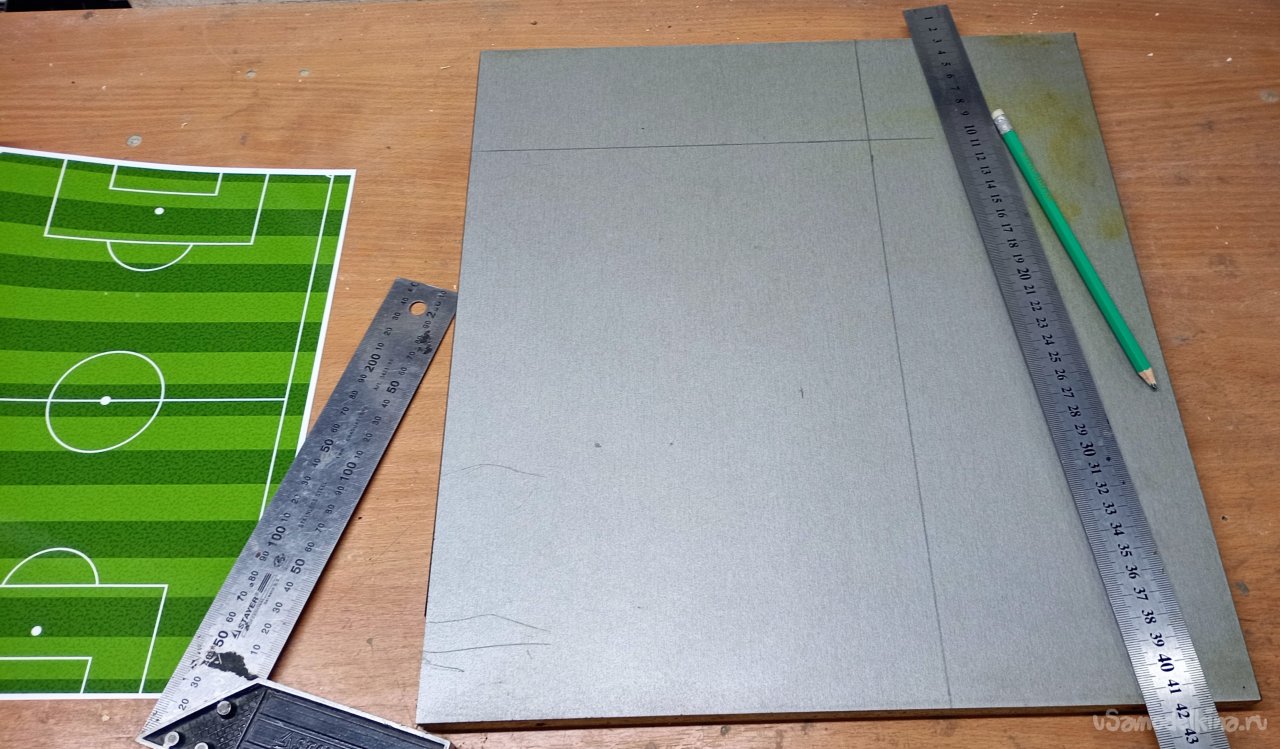Следующим этапом стало изготовление самого поля. В качестве основы я выбрал ламинированную ДСП плиту. Этот материал идеально подходил для моей задумки: он прочный, гладкий и легко поддается обработке. Я аккуратно выпилил прямоугольник размерами 300 мм на 210 мм. Эти размеры показались мне оптимальными для компактной, но в то же время удобной для игры настольной версии.
