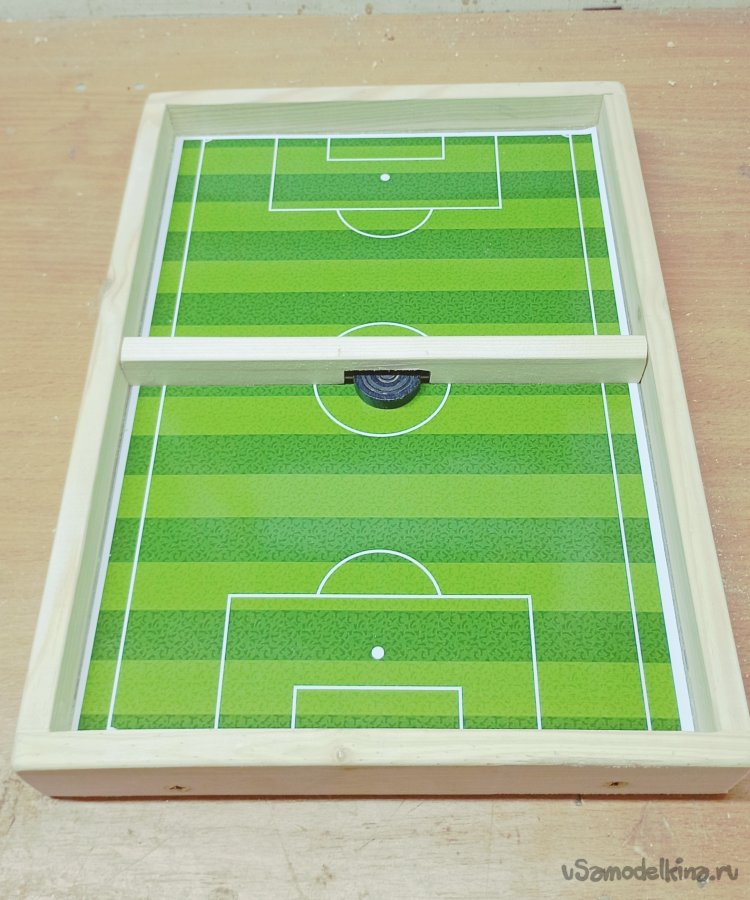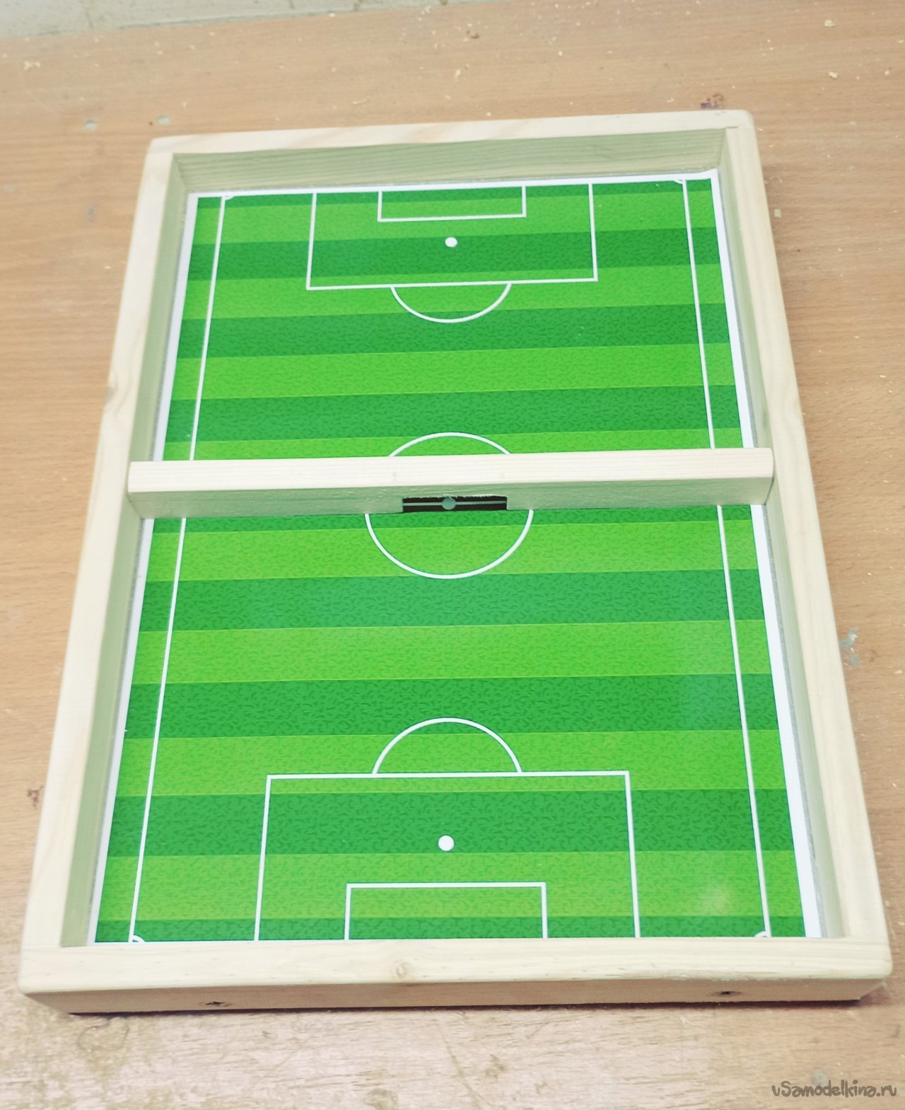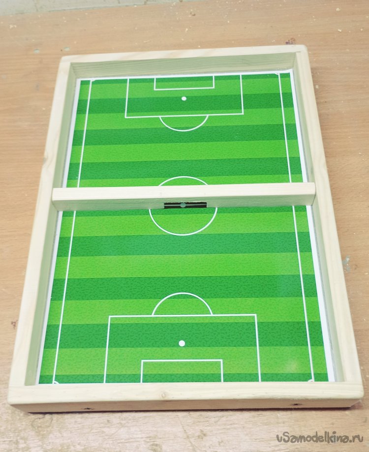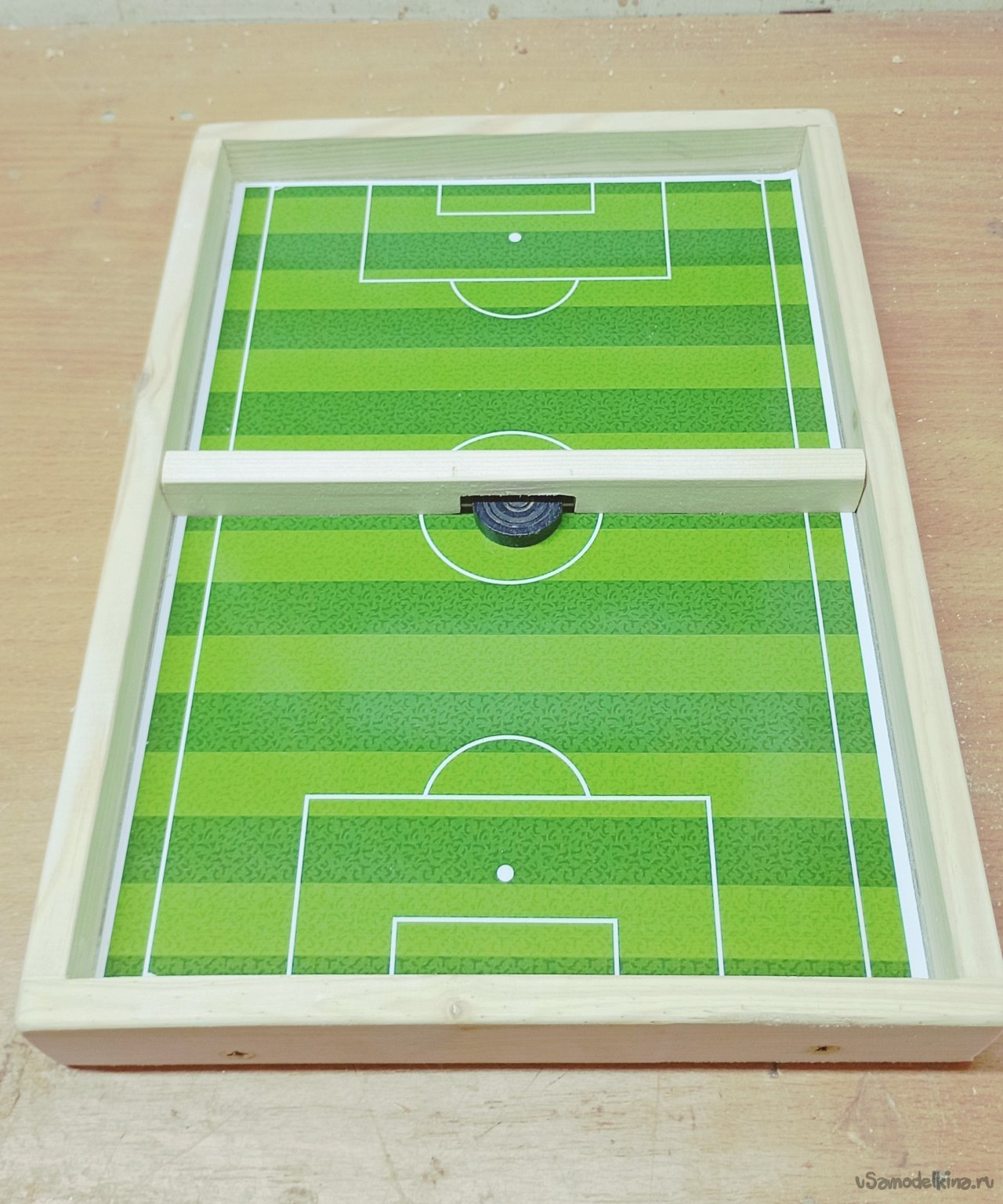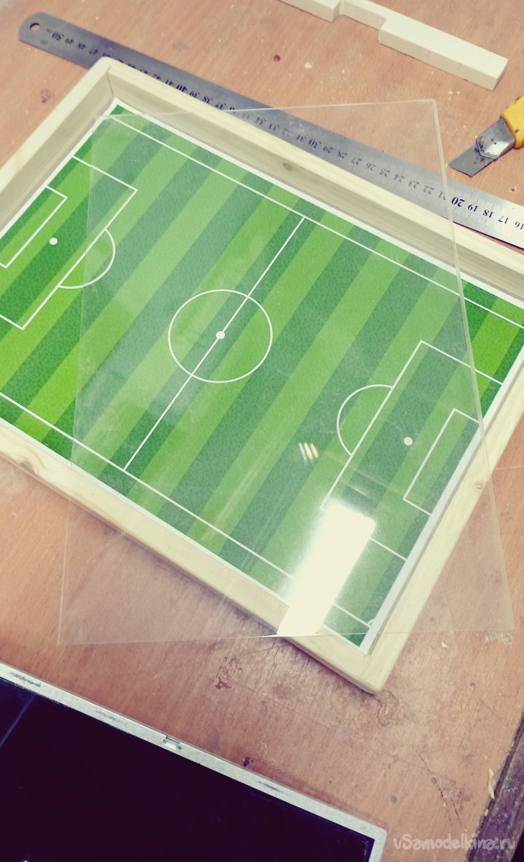Но тут возникла проблема: шайбы должны скользить по полю, а не по бумаге. Бумага, даже самоклеящаяся, не обеспечивала нужного уровня скольжения, и к тому же быстро бы изнашивалась. И тут мне пришла в голову идея! У меня валялся бесхозный монитор, из которого я достал тонкий прозрачный миллиметровый лист из карбоната. Этот материал идеально подходил для моей задумки: он прочный, гладкий и абсолютно прозрачный. Я вырезал его точно по габаритам игрового поля и аккуратно уложил сверху. Это было идеальное решение! Теперь шайбы могли свободно скользить, а рисунок поля был надежно защищен от истирания и повреждений. После того как защитный слой был уложен, закрепил брусок с пазом, разделяющий поле пополам, точно по центру. Это обеспечило не только четкое разделение игровых зон, но и дополнительную фиксацию карбонатного листа, предотвращая его смещение во время игры.