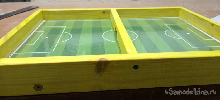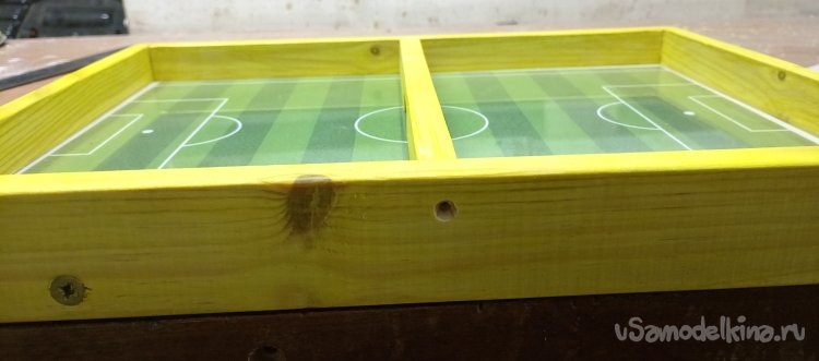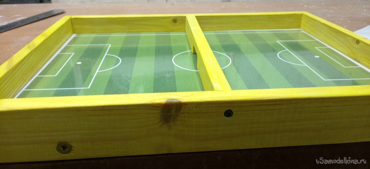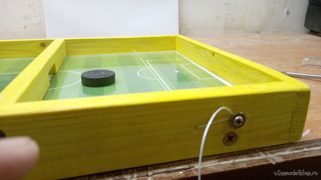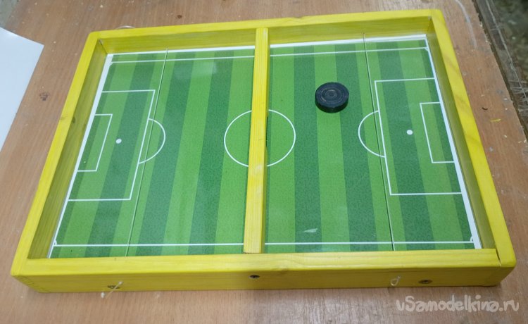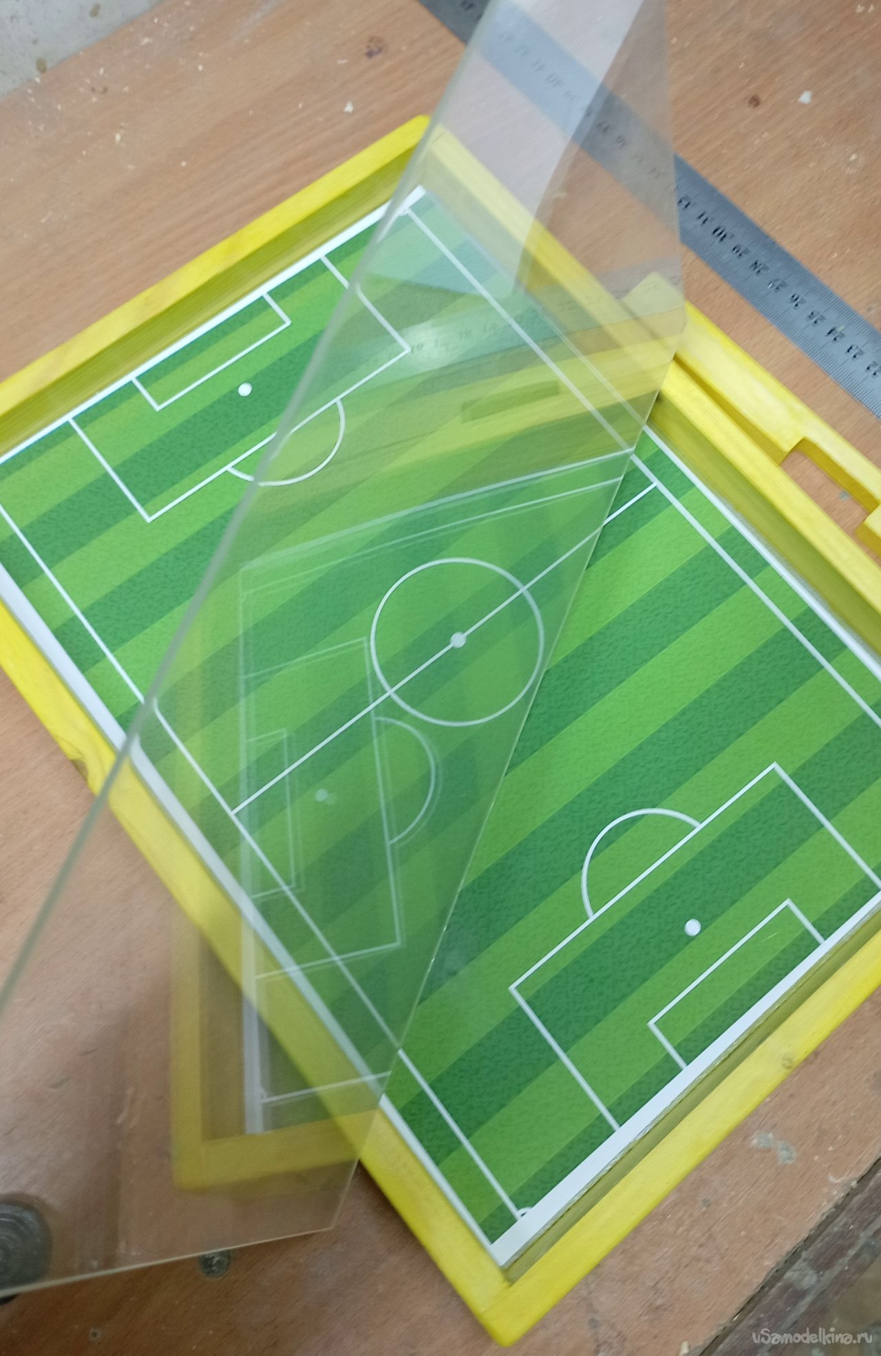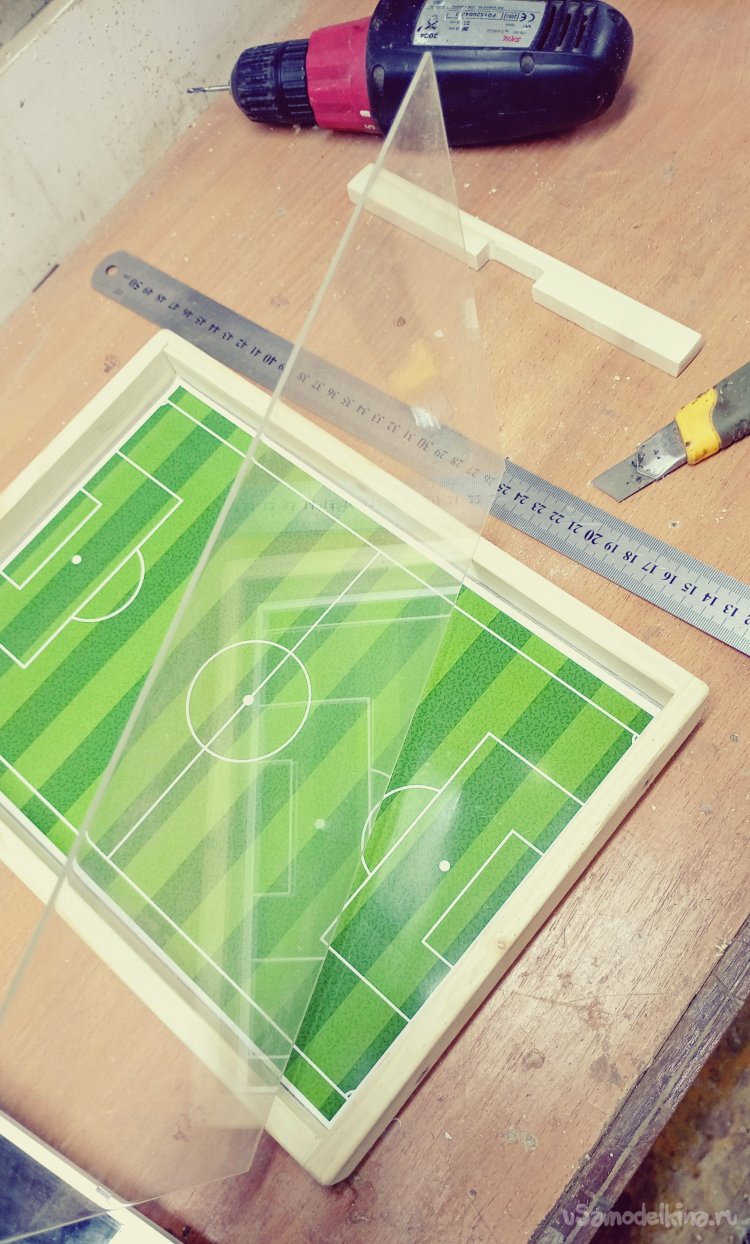 Но тут возникла проблема: шайбы должны скользить по полю, а не по бумаге. Бумага, даже самоклеящаяся, не обеспечивала нужного уровня скольжения, и к тому же быстро бы изнашивалась. И тут мне пришла в голову идея! У меня валялся бесхозный монитор, из которого я достал тонкий прозрачный миллиметровый лист из карбоната. Этот материал идеально подходил для моей задумки: он прочный, гладкий и абсолютно прозрачный. Я вырезал его точно по габаритам игрового поля и аккуратно уложил сверху. Это было идеальное решение! Теперь шайбы могли свободно скользить, а рисунок поля был надежно защищен от истирания и повреждений. После того как защитный слой был уложен, закрепил брусок с пазом, разделяющий поле пополам, точно по центру. Это обеспечило не только четкое разделение игровых зон, но и дополнительную фиксацию карбонатного листа, предотвращая его смещение во время игры.