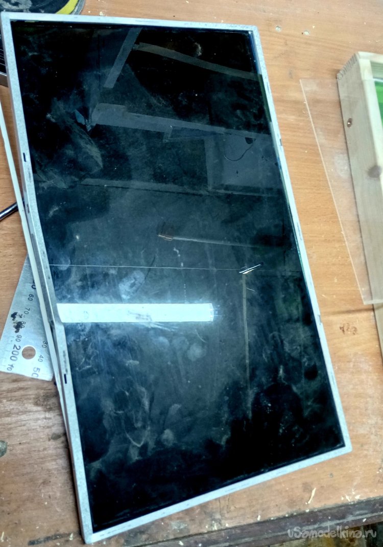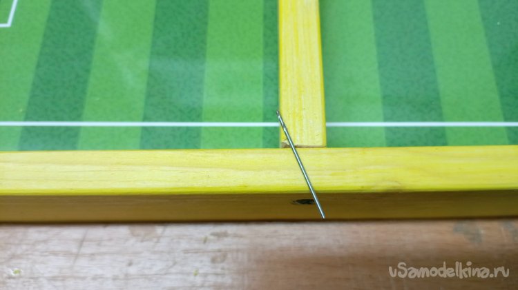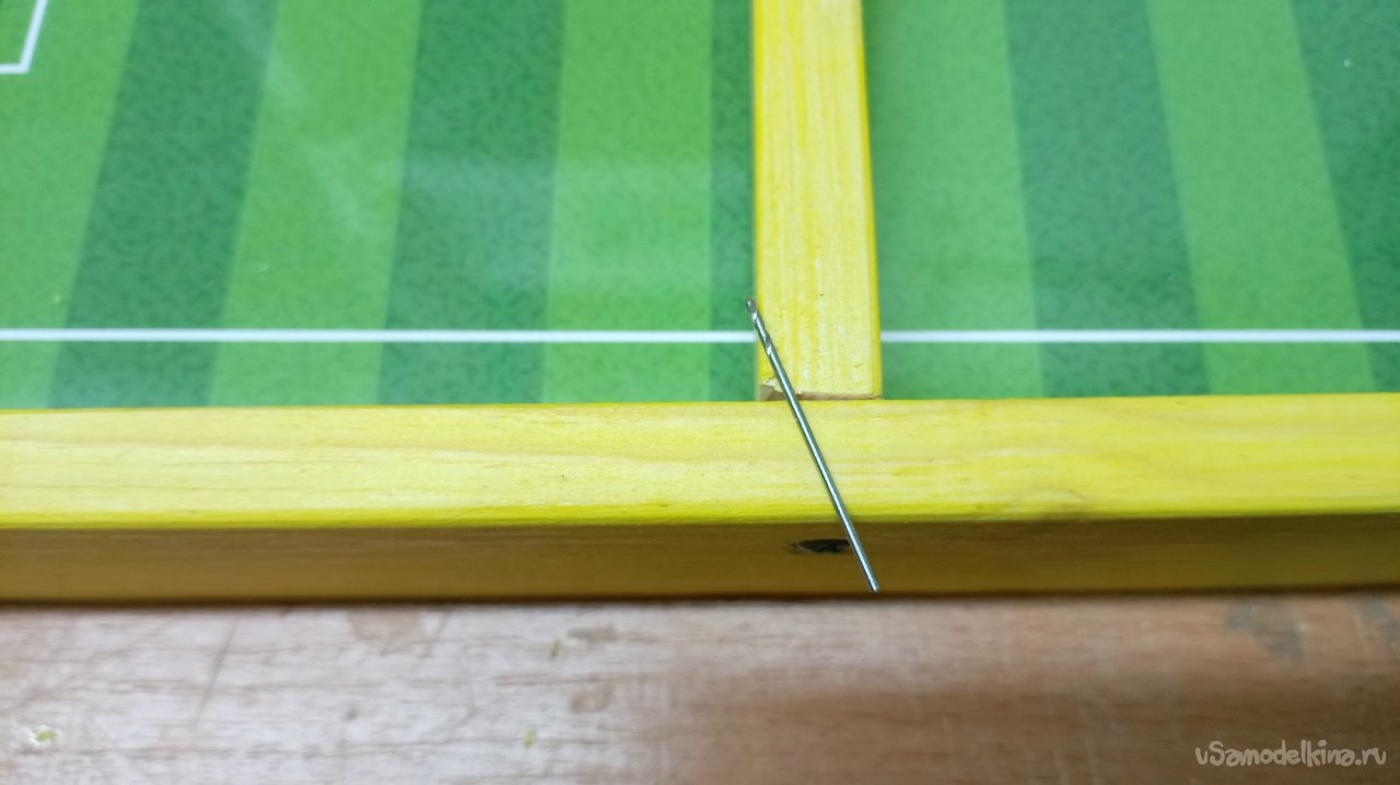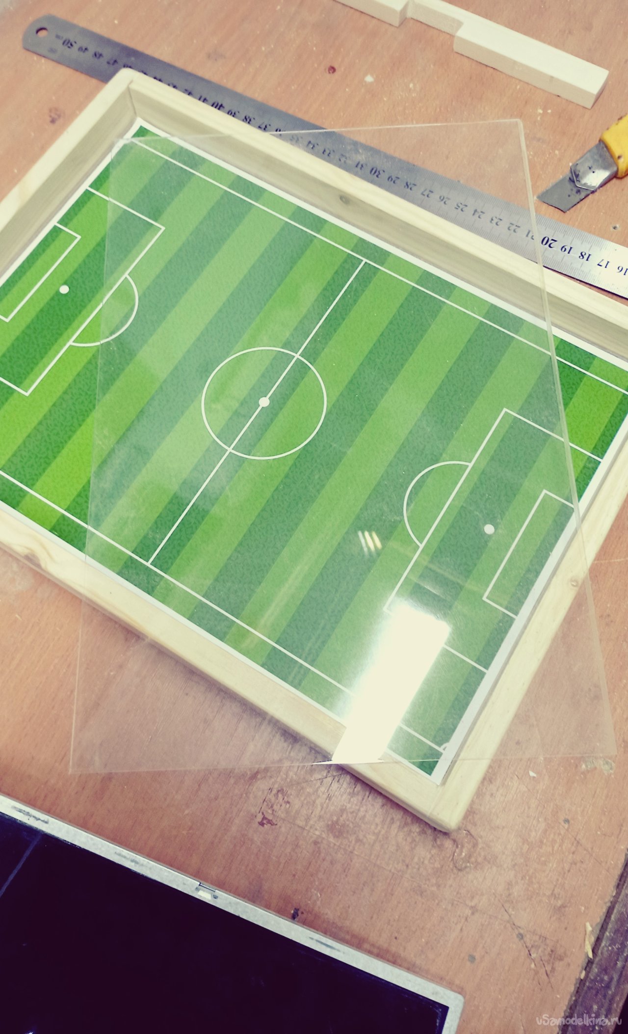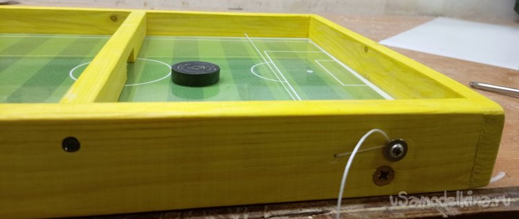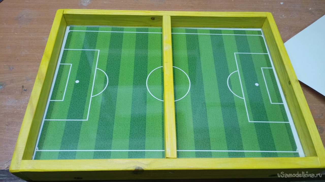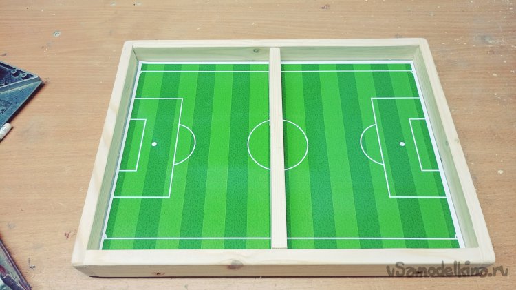 Но тут возникла проблема: шайбы должны скользить по полю, а не по бумаге. Бумага, даже самоклеящаяся, не обеспечивала нужного уровня скольжения, и к тому же быстро бы изнашивалась. И тут мне пришла в голову идея! У меня валялся бесхозный монитор, из которого я достал тонкий прозрачный миллиметровый лист из карбоната. Этот материал идеально подходил для моей задумки: он прочный, гладкий и абсолютно прозрачный. Я вырезал его точно по габаритам игрового поля и аккуратно уложил сверху. Это было идеальное решение! Теперь шайбы могли свободно скользить, а рисунок поля был надежно защищен от истирания и повреждений. После того как защитный слой был уложен, закрепил брусок с пазом, разделяющий поле пополам, точно по центру. Это обеспечило не только четкое разделение игровых зон, но и дополнительную фиксацию карбонатного листа, предотвращая его смещение во время игры.