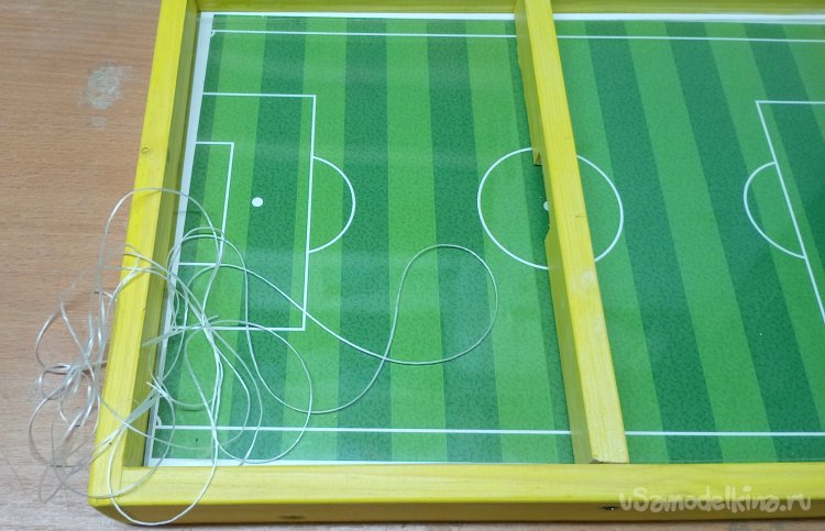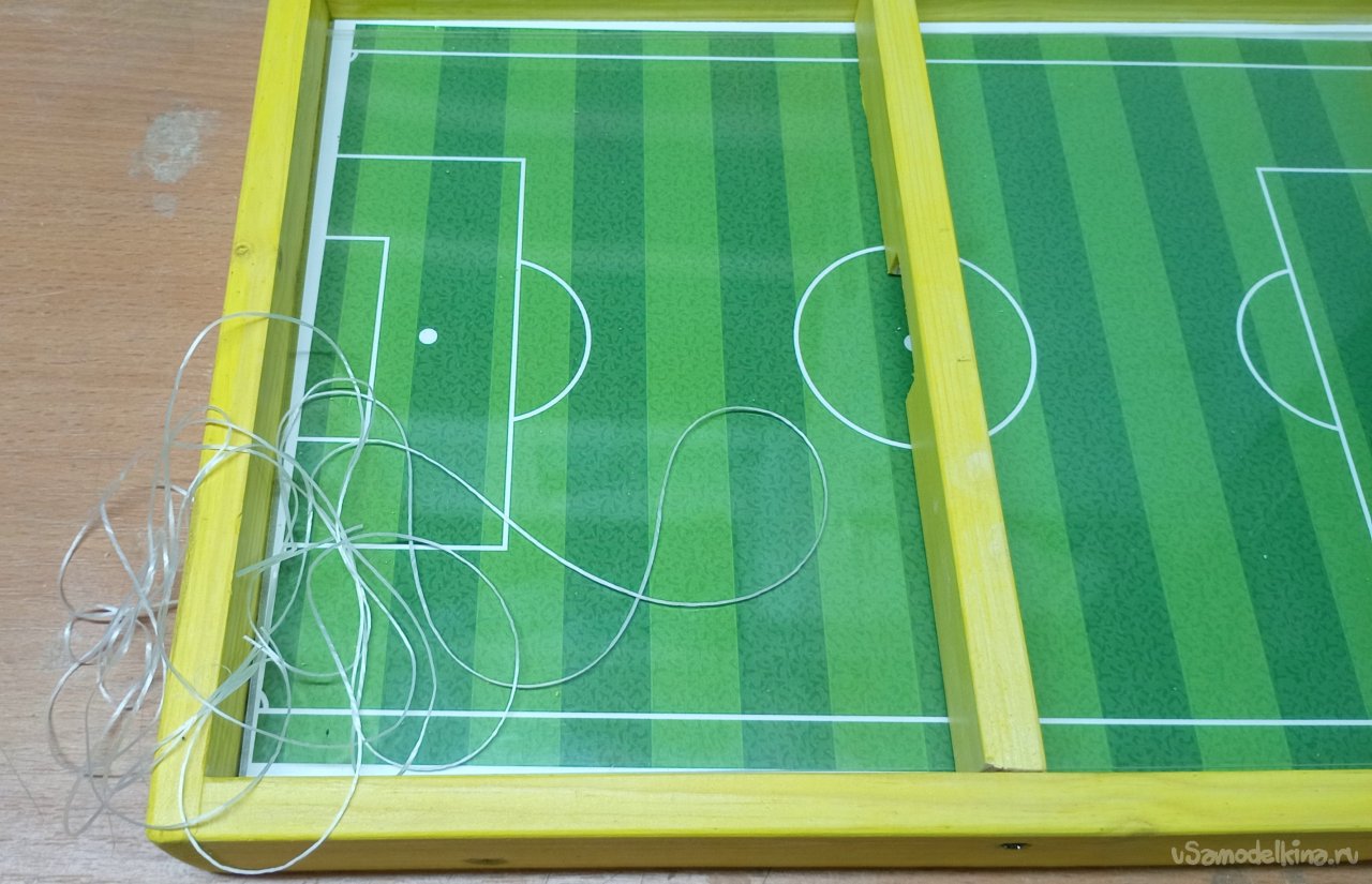 Через эти отверстия просунул резинки, тщательно натягивая их и закрепляя узлами с обратной стороны. Я использовал несколько резинок, чтобы создать достаточное натяжение и обеспечить хороший отскок для шашек. Экспериментируя с количеством и натяжением резинок, я добился оптимального баланса, который позволял шашкам быстро перемещаться по полю, но при этом не вылетать за его пределы.