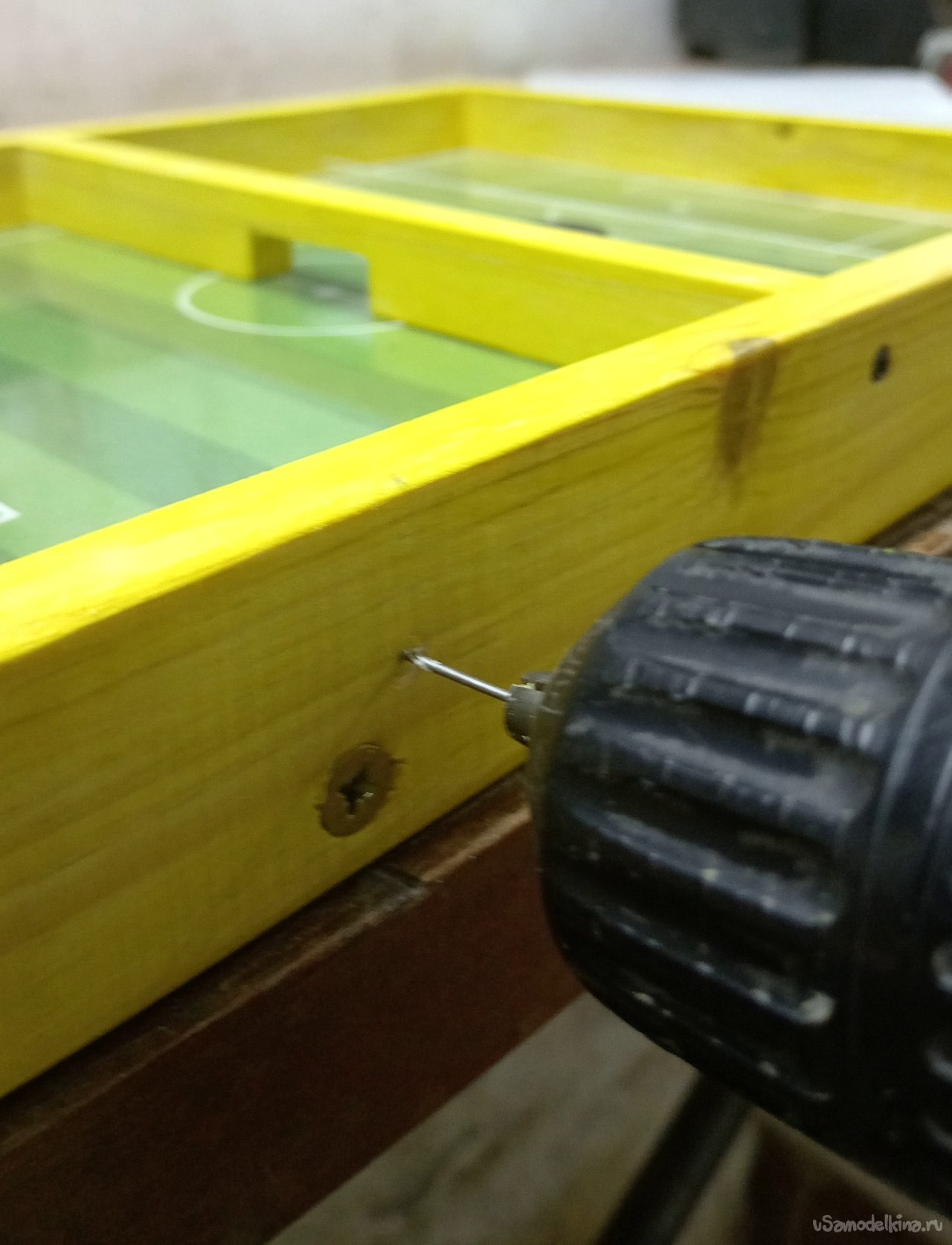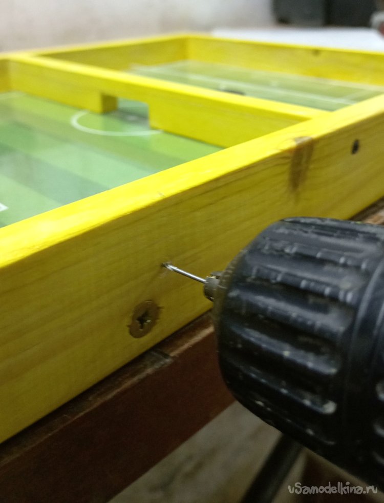 Заключительный этап создания "Вышибай-ки" был, пожалуй, самым волнительным – натяжка резинок. Именно резинки придают игре динамику и делают ее по-настоящему увлекательной. Я взял тонкое сверло и аккуратно просверлил небольшие отверстия по периметру игрового поля, отступив от краев на одинаковое расстояние. Важно было сделать отверстия достаточно тонкими, чтобы резинки плотно сидели, но при этом не рвались при натяжении.