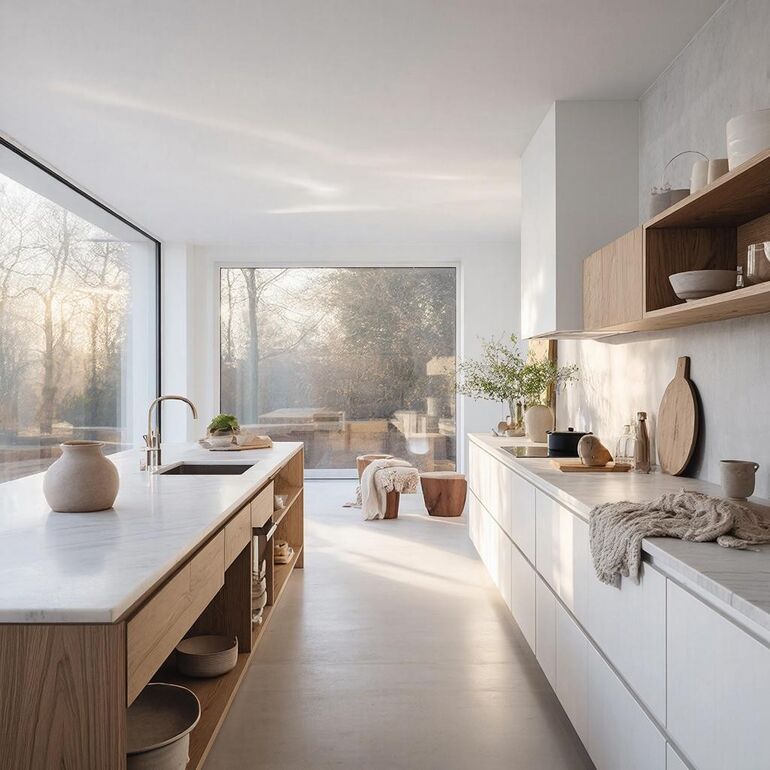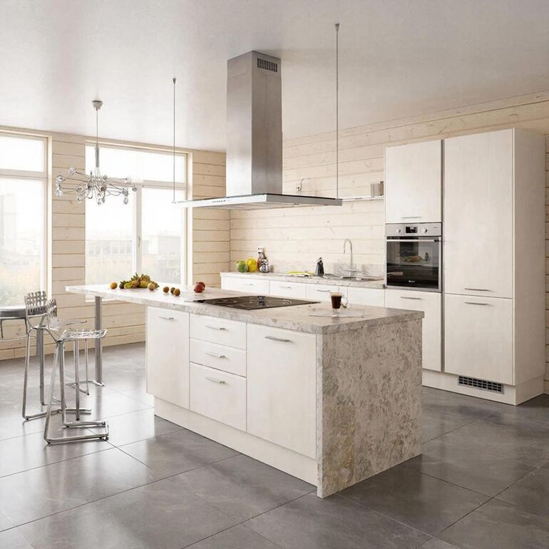 Для столешниц и фартуков актуальны кварцевый агломерат, керамогранит с имитацией натурального камня и инновационный HPL-пластик нового поколения. Эти материалы сочетают эстетику с практичностью: они устойчивы к влаге, температуре и механическим повреждениям, что особенно важно для интенсивно используемых кухонных зон. При этом современные технологии позволяют добиться высокой степени реалистичности в имитации природных текстур.