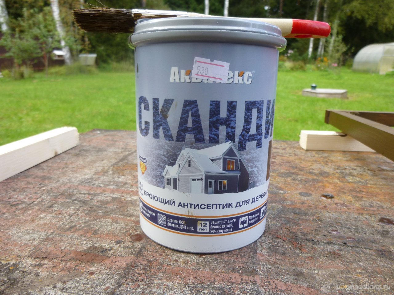 В этом году отвернул шурупы, снял защиту, подключил станцию и…, показалось, что трачу время зря. Решил сделать что-то более рациональное, а именно, съёмную защиту. Уже осень, дел особых нет, самое время что-нибудь облагородить. Пошукал по сусекам — всё, вроде, было: брусок 30х30 мм, профлист от забора, резьбовые костыли Ø5х60 мм. Всё, кроме краски. Пришлось за ней съездить в ближайший строймаг (хорошо, что банку с покраски домика для насосной станции не выкинул). Купил за 930 руб., такая же краска, только банка другая (дорого, но пригодится ещё ни раз).